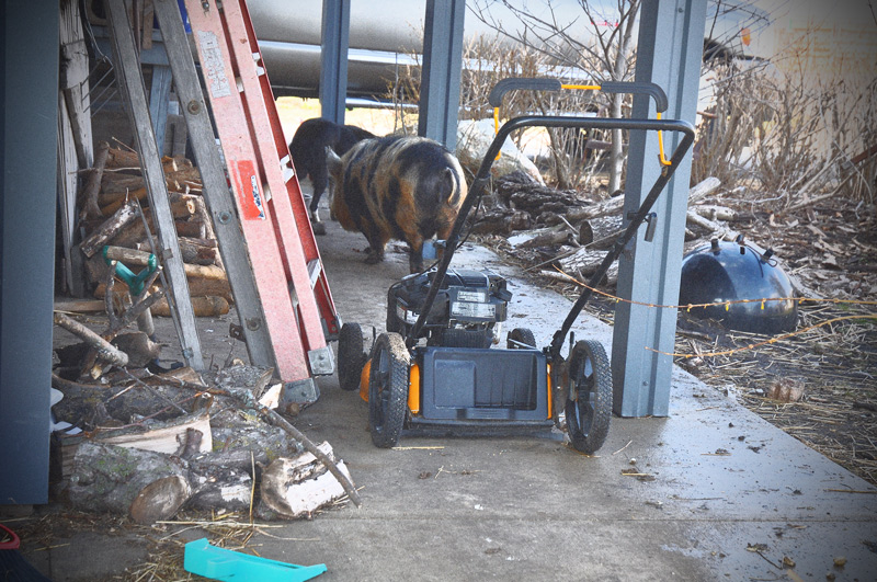 Molly does not just watch the work she wants to be actively involved. She was being very naughty yesterday – jumping up on all the gates and fences, digging under them – grunting merrily and running to and fro, she is excited as all the new smells are unearthed while I create the little room. I will be building the piles of straw very high, as usual, so she cannot see out into the barn. This makes all the difference in calming her down.