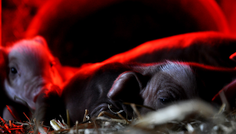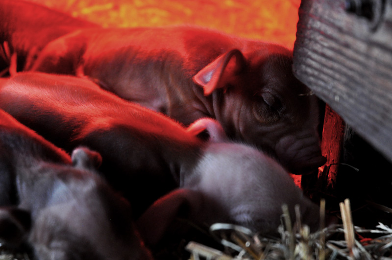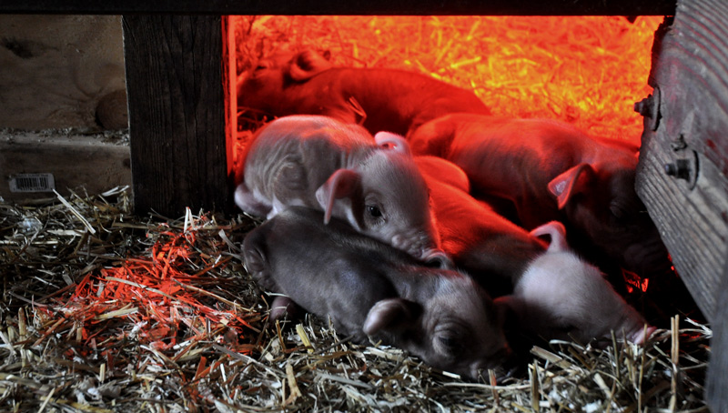 The little piglets have found their warm spot and when not having a drink they sleep in their little heated creep, much to the cats despair. The cats had been keeping it warm for the piglets for the last few weeks. The cats sit on top of the bales looking down and wondering what went wrong.