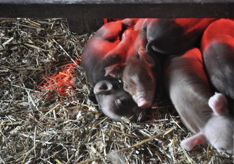 The piglets had a good day yesterday. They are almost always sleeping half in and half out of their creep. There is a big heavy bar above the door so they are perfectly safe there. These piglets seem slower than other litters I have had. They sleep more and they sleep deeply. They have full tummies though. And they are sleeping in their warm room. Maybe today they will start waking up.
