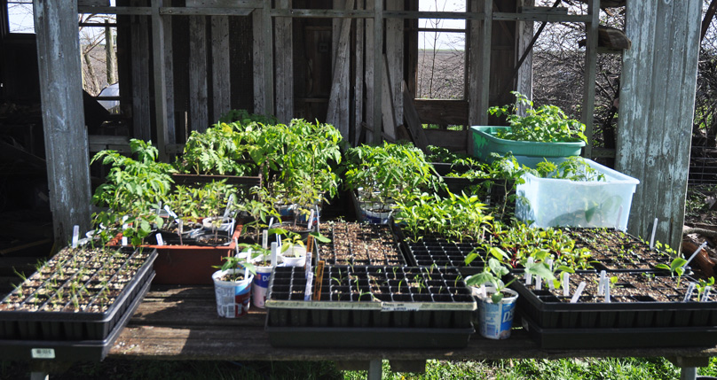 Above is one of the tables of vegetable plants. We have another table full and the glasshouse is still hard at work germinating. Note all the tomatoes. There are also a lot of cabbages this year for the cows garden and for sale of course. The cows garden grows vegetables for me to cut up for Lady Astor at milking time.
