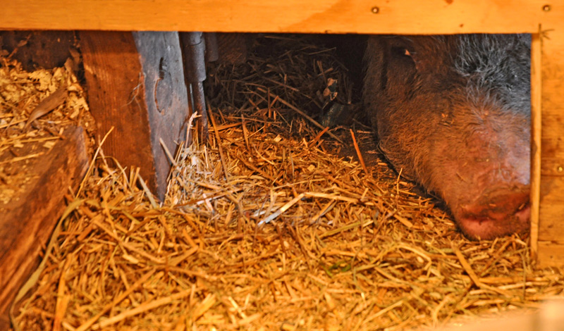 Molly lies there for ages – just watching her babies and sharing a little warmth from the light. Every time she gets up she hits her forehead on the bar above her head. The bar keeps her from blocking the piglet entrance but the bar is a new addition to the farrowing pen and she cannot remember it is there.