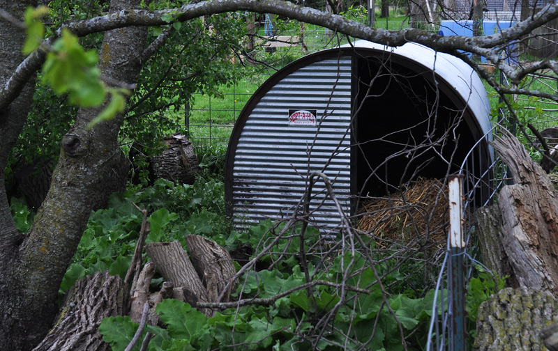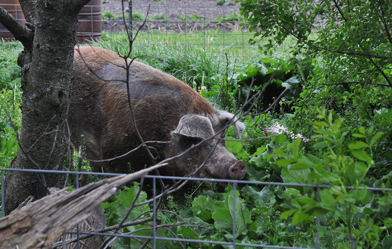 Yesterday Sheila toddled happily into the tiny field by the clothes line. She has to leave the barn when farrowing is close. And Poppy is getting very close – her due date is Thursday.