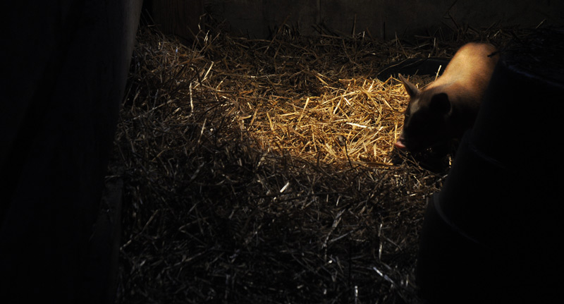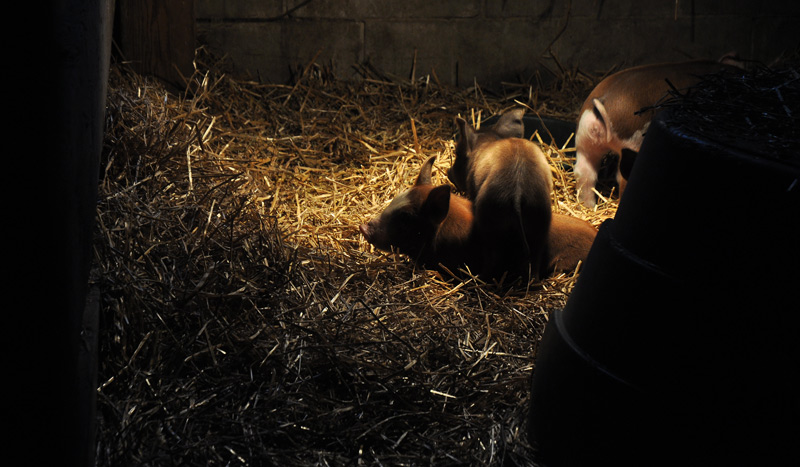 Of course by evening Molly had broken out of her field, gone into the barn through Sheila’s vacated pen, enlarged a hole in the back wall (that Sheila uses to stick her head through to see what is going on in the barn) then down the corridor,  smashed through an outer door, hung out with the cows, digging holes for a while – with the barn door wide open behind her – then by the time I found her she was sleeping outside the piglets door. I closed the doors, then I let her back in with her babies. It was too late to do all those repairs. She promised to be quiet, then once in – threw herself onto the floor and called her piglets out for a feed. They were loud with exclamations of delight.