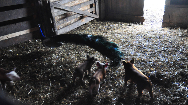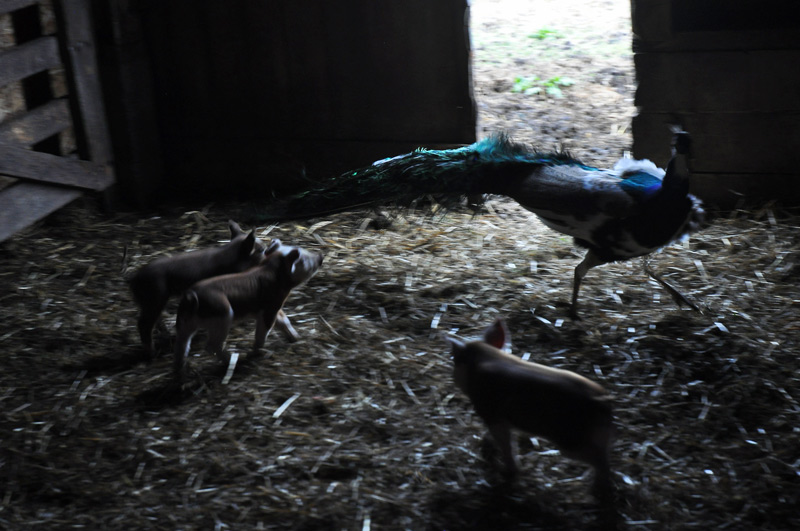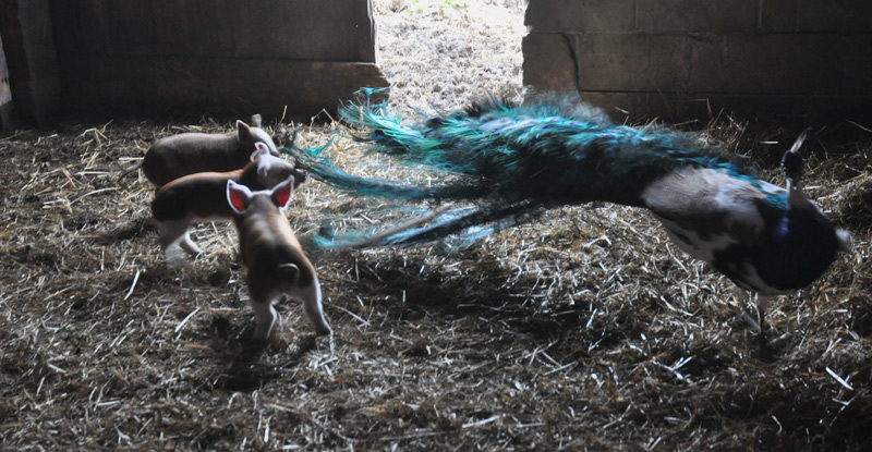 I shifted Molly into the rat house and the moment she was gone the piglets turned into vandals tormenting the big birds. The danced and played unfettered behaving like little rascals.  If they were little Victorian orphans they would be running through the streets knocking off hats, stomping in puddles and stealing fob chains with swinging shiny watches that they would toss to each other as they gamboled and laughed.