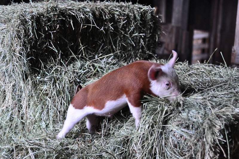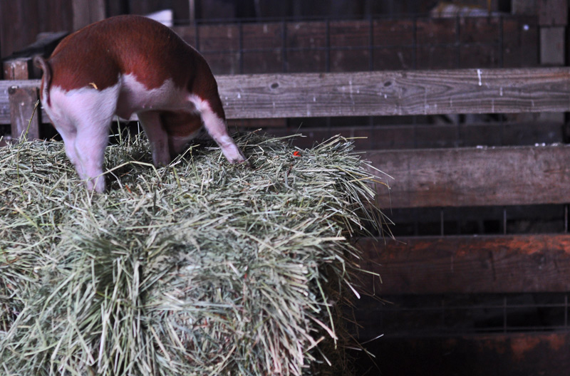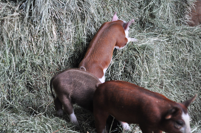 The tower of hay (which Lady is enjoying eating at her milking time along with her grain treats) has been taken over by a bunch of pigs who think they are goats.