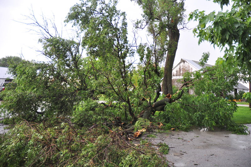 I was inside when I heard a loud crack of lightning. And down came half the old elm tree, smack into the little walnut tree, splitting that young tree in half as well.