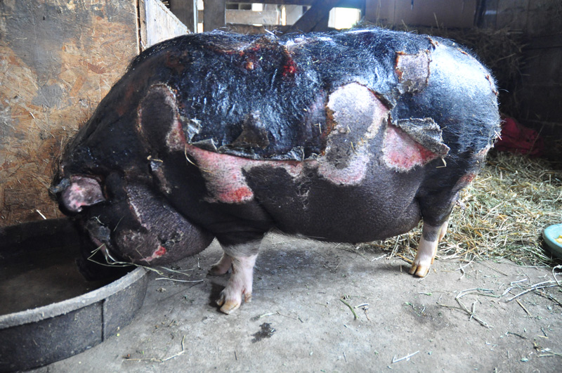 Hello, I have 2 potbelly pigs and one has skin that looks just like this. I’ve been searching and searching and this is the only post that matches the condition of the one who’s has suffered the worst. Do you have any idea what caused this? Also, did the treatment end up working on Wei?