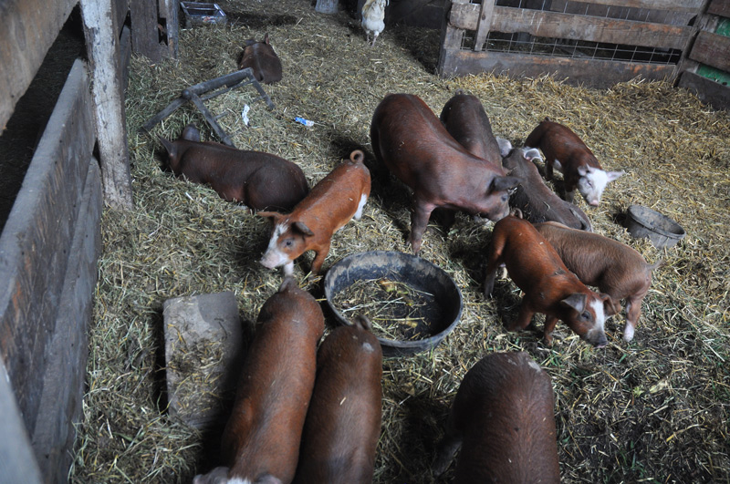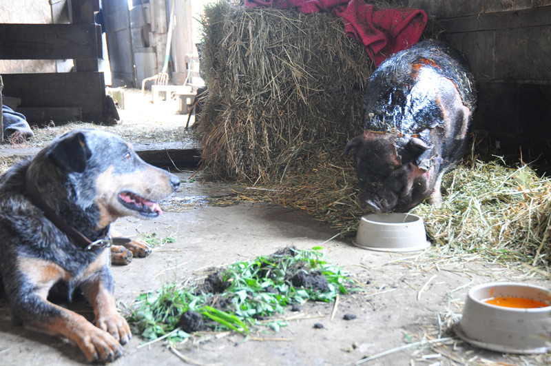 Because Wai The Armadillo Pig is not allowed outside in the sunshine during the day, I have opened up the barn corridors so he can roam about in there. Generally he does not want to go anywhere and I have to get out a big board and herd him out for a walk. Exercise is a very important part of his recovery.