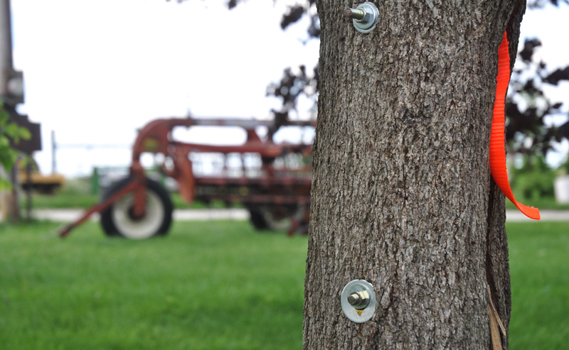 John heeded the advice from the Lounge of Comments and bolted my young walnut together though the ratchet straps will stay for a while to help it along. These things take time for John as he only has one day on the farm a week but it is a good start. The leaves on the tree are still green and perky.