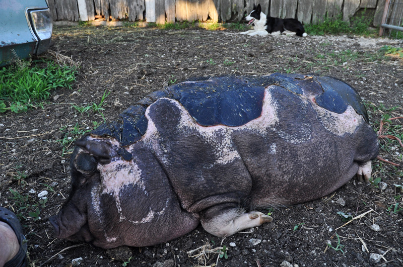 I tried not to worry about dirt getting into his wounds, laid my pitchfork on the ground and sat next to the pig for a while to scratch his belly. he has never laid down beside me before. As you can see he cannot lay too far on his side. He is such a fat wee thing. And as his skin seems to worsen so his piglike nature seems to lift. I must conclude that his skin is working itself out in ways I cannot fathom.