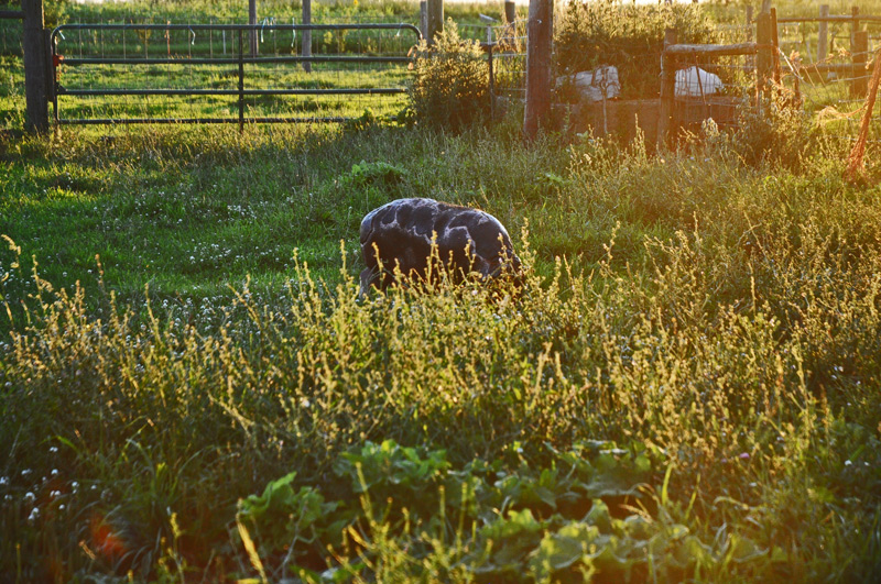 Yesterday after another big farm to table lunch I shifted the cows to a new field, scooping the naughty baby bobby into the barn for the night as they went past. They all put their heads down and began munching on all that clover.