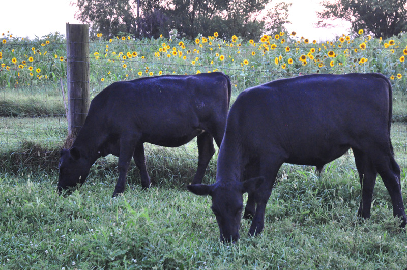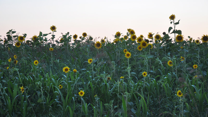 Even in the dusky light, that lends a silver to the vibrant green of the corn in this patch, the flowers stand up straight and tall.