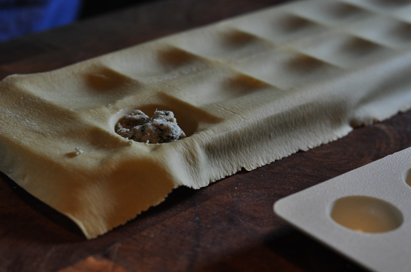 Yesterday Chicago John drove down from the city to help us make ravioli for the freezer. This is an old family tradition and he came armed with the filling and the flour, his rollers and molds. Everything we needed. My chickens supplied the eggs of course!