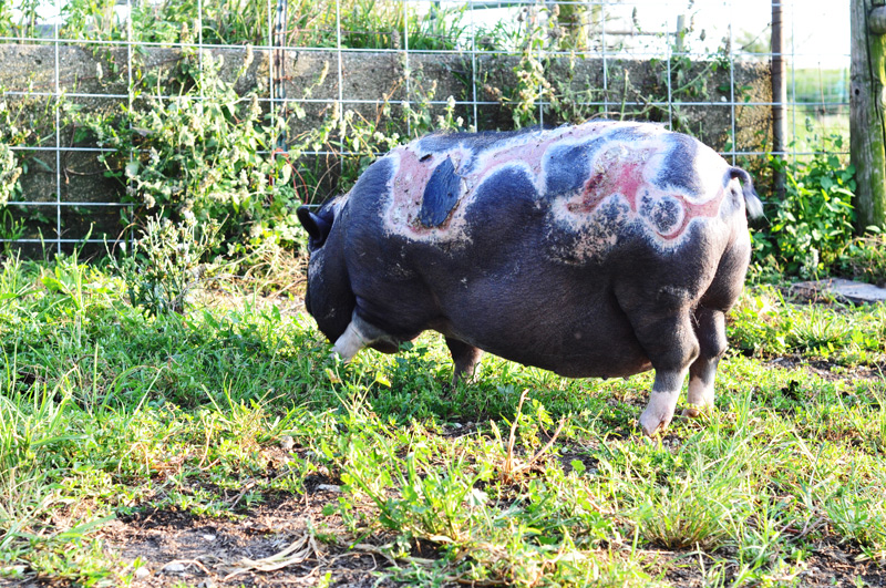 She spent quite a bit of time leaning over the fence watching Wai the litte rescue potbelly waddle about the yards eating weeds in the late evening light. That string holding the fence together looks like a bow under her chin doesn’t it! But it is not. Never fear.