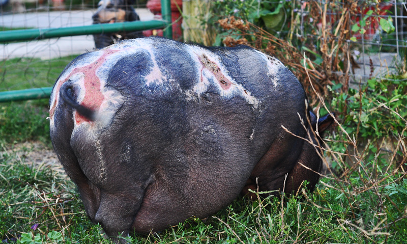 I mean this bottom. (Below) Wai the Wonder Pig. See how the healing is not only coming together perfectly but Wai’s skin is actually evening out. No crater scars. Growing from the inside out – the deep crevasses, some so deep I could put a finger in them up to the knuckle, are smoothing and his black skin is coming back.