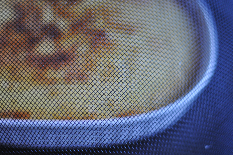 She leans her head over the door and looks quite perplexed watching her friend Astor loudly munch her GM free treats while being milked.