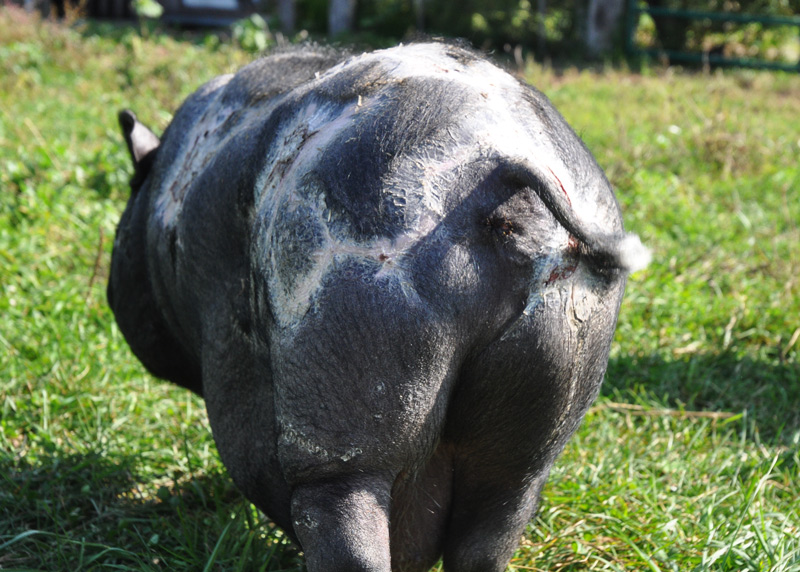 WaiWai is out with me half the day now. I have increased his exposure to the sun in tiny increments watching for damage and it seems we are past the worst and now the sun is helping. he looks like a harlequin pig from the behind don’t you think?