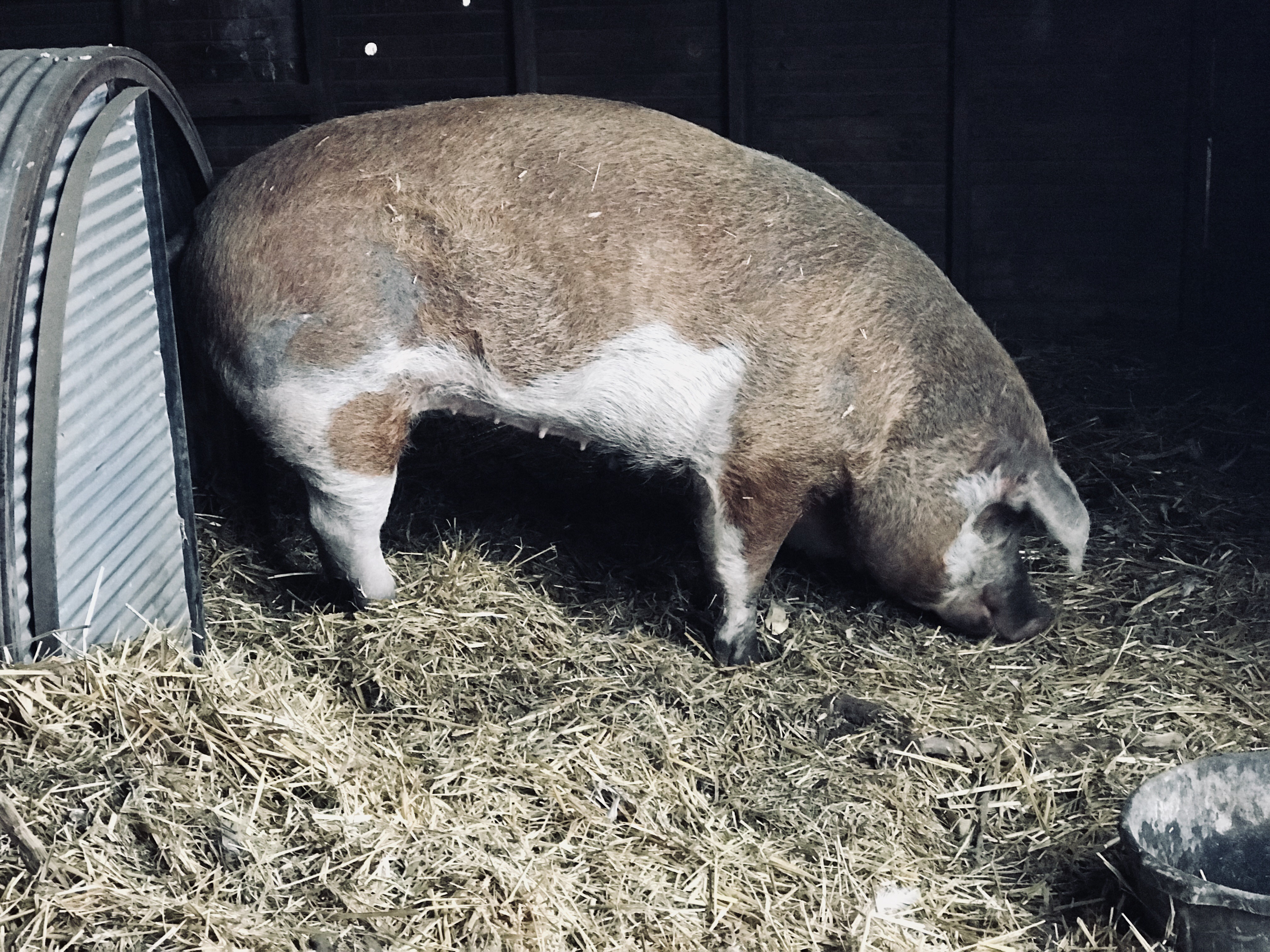 Wai (the potbelly rescue pig) has done very well. Due to his hibernating behaviour in the cold (no scraping the scabs off on his walks) his back has been healing very well. There are no cracks in the skin which is great. I was expecting the worst. He refused to come close to John at all while I was gone but he jolted out of his hut when he heard my voice yesterday morning. He padded across for a scratch and a moan to me – ate his apple and banana and went back to bed.