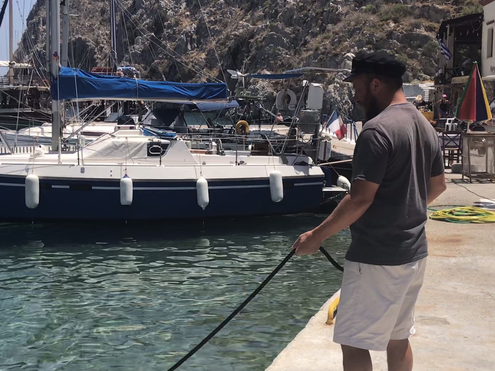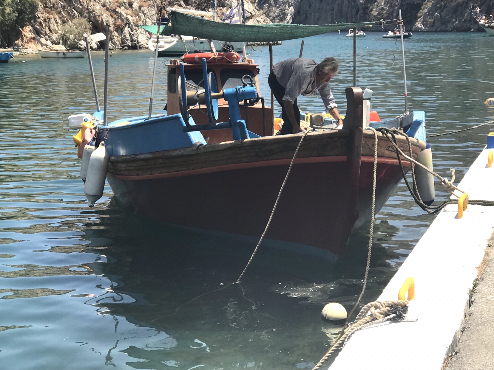 The square was totally set up to capture tourists. The whole village seemed to be in on it. There were two big sloops moored under the cliffs disgorging many scantily clad sunburnt slow walking island hopping tourists. As they hit terra ferma the village came alive with fresh juices and Greek doughnuts and the usual line up of shells and hats and bags and sunglasses from China.
