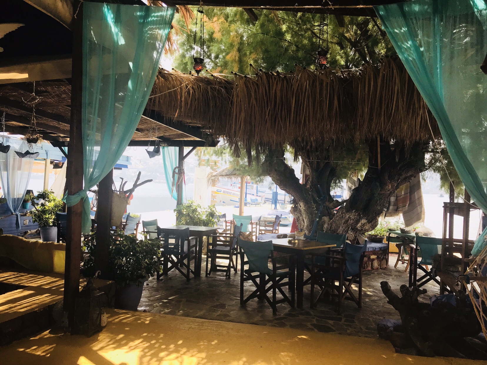 All the cafes and restaurants in Kalymnos, and this island Telendos, are outdoor. Often the kitchen is the central building with all the non locals kept out on the wide verandahs. We are not invited inside.