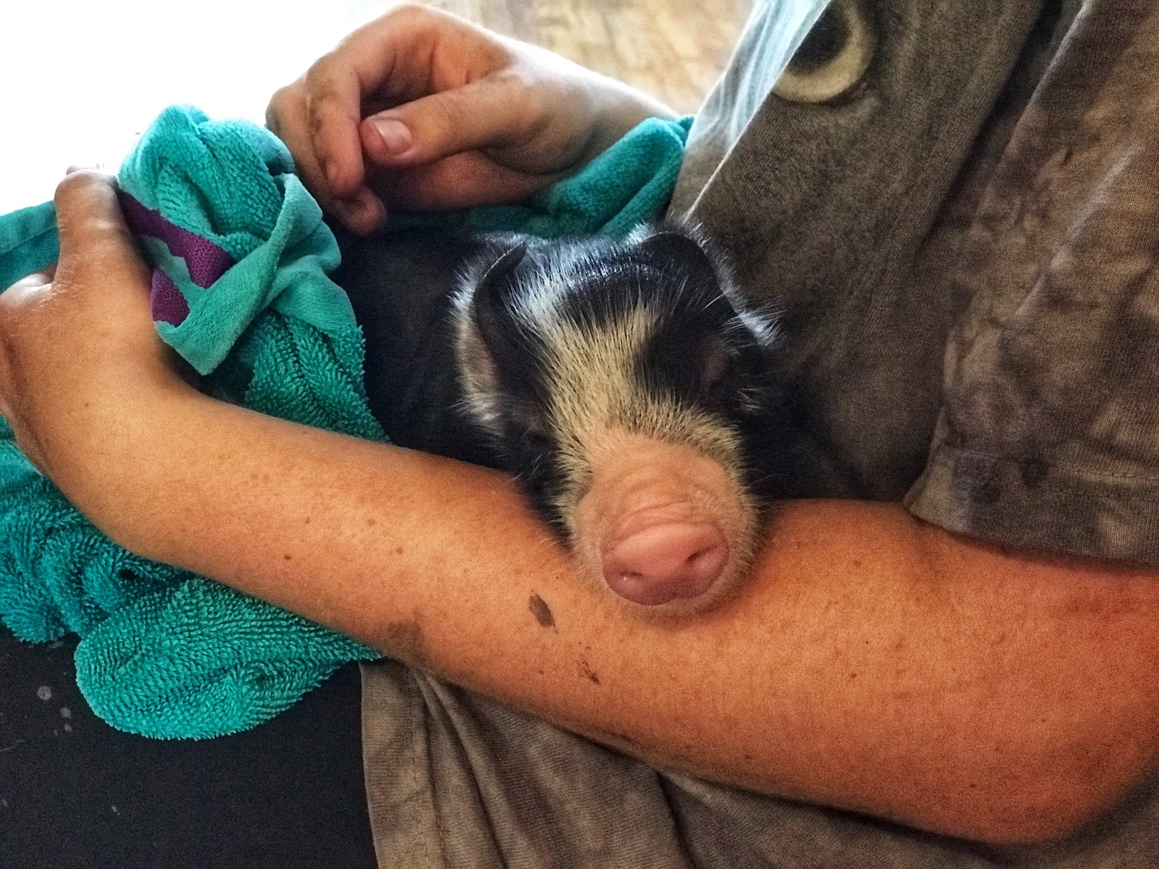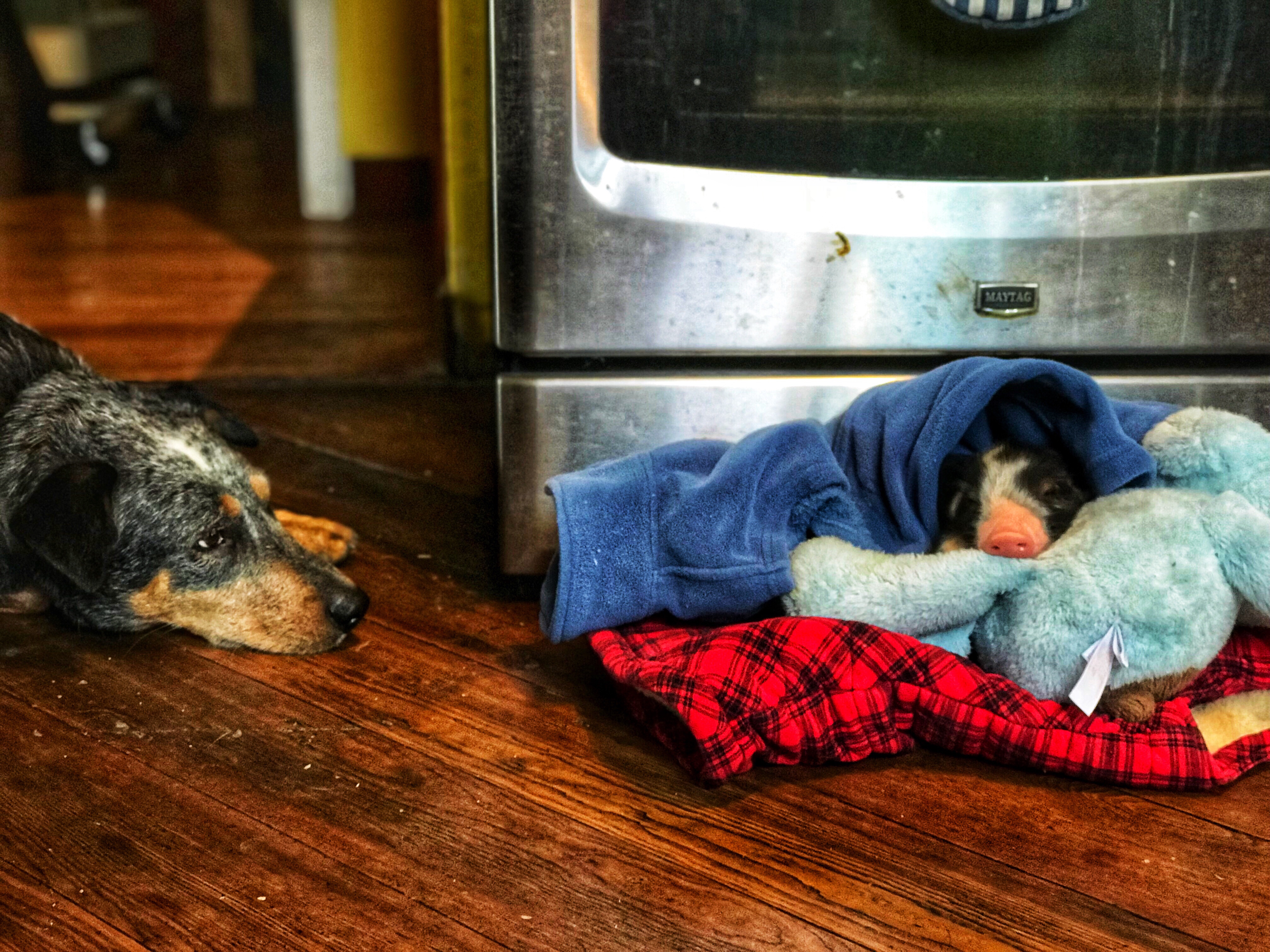 Yesterday I was cooking pork for pulled pork for the funeral dinner of a friends father and Piglet decided to come down and camp on a fallen oven mitt by the warm oven door . I replaced the mitt with his bed and he slept there all day – between feeds – in the kitchen. Warmed by the oven. The irony was not lost.
