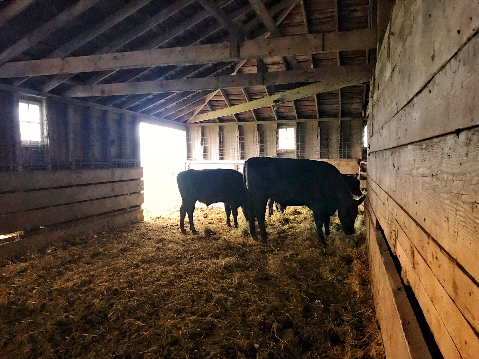 I weaned the Angus mothers ( 84 and 73) from their calves on Monday and on Wednesday I opened their big door so they could see out and introduce themselves to the two black steers who live on the West Side, and yesterday I opened the gate so they could all eat together.