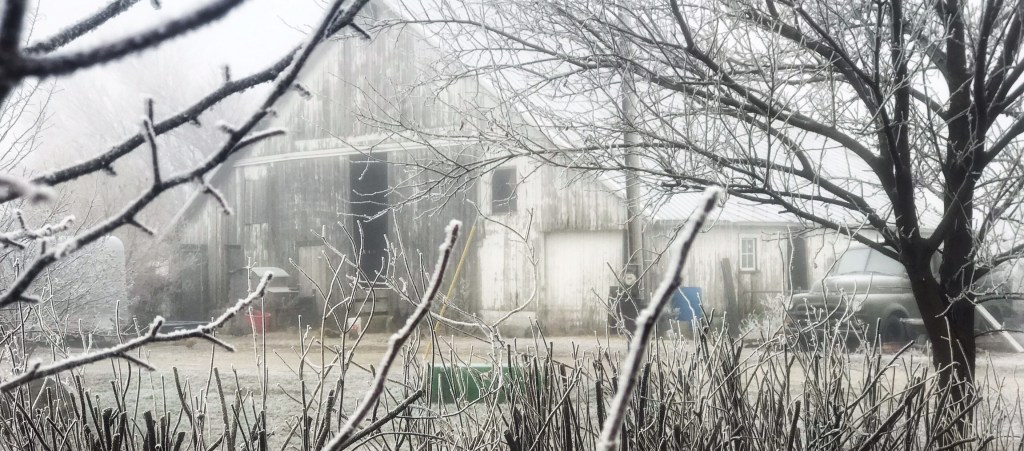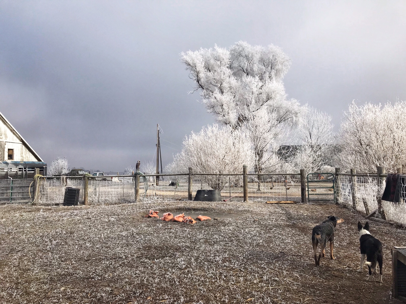 The frost yesterday began with a heavy mist that hung about for hours. At 11f (-11C) it was frigid. It was my last delivery day for hogs and I was driving blind.