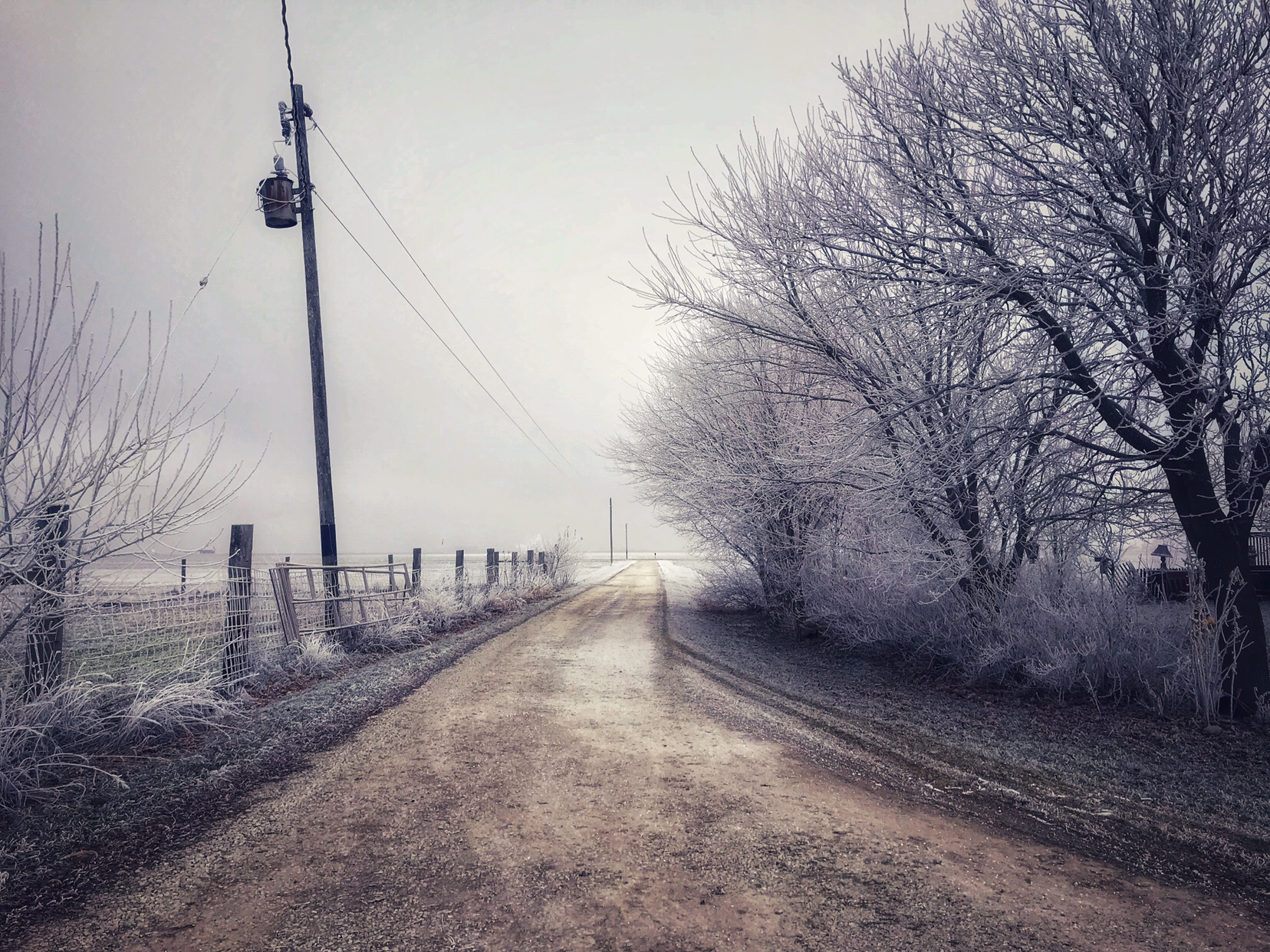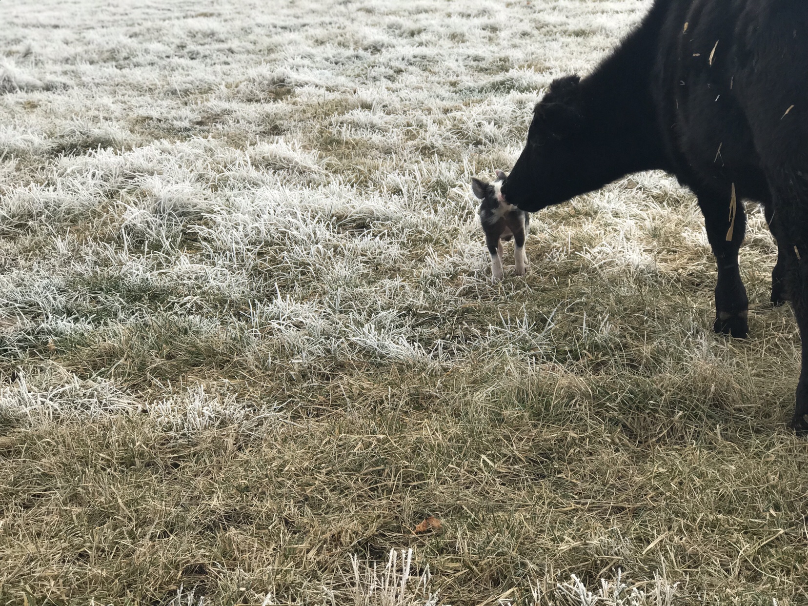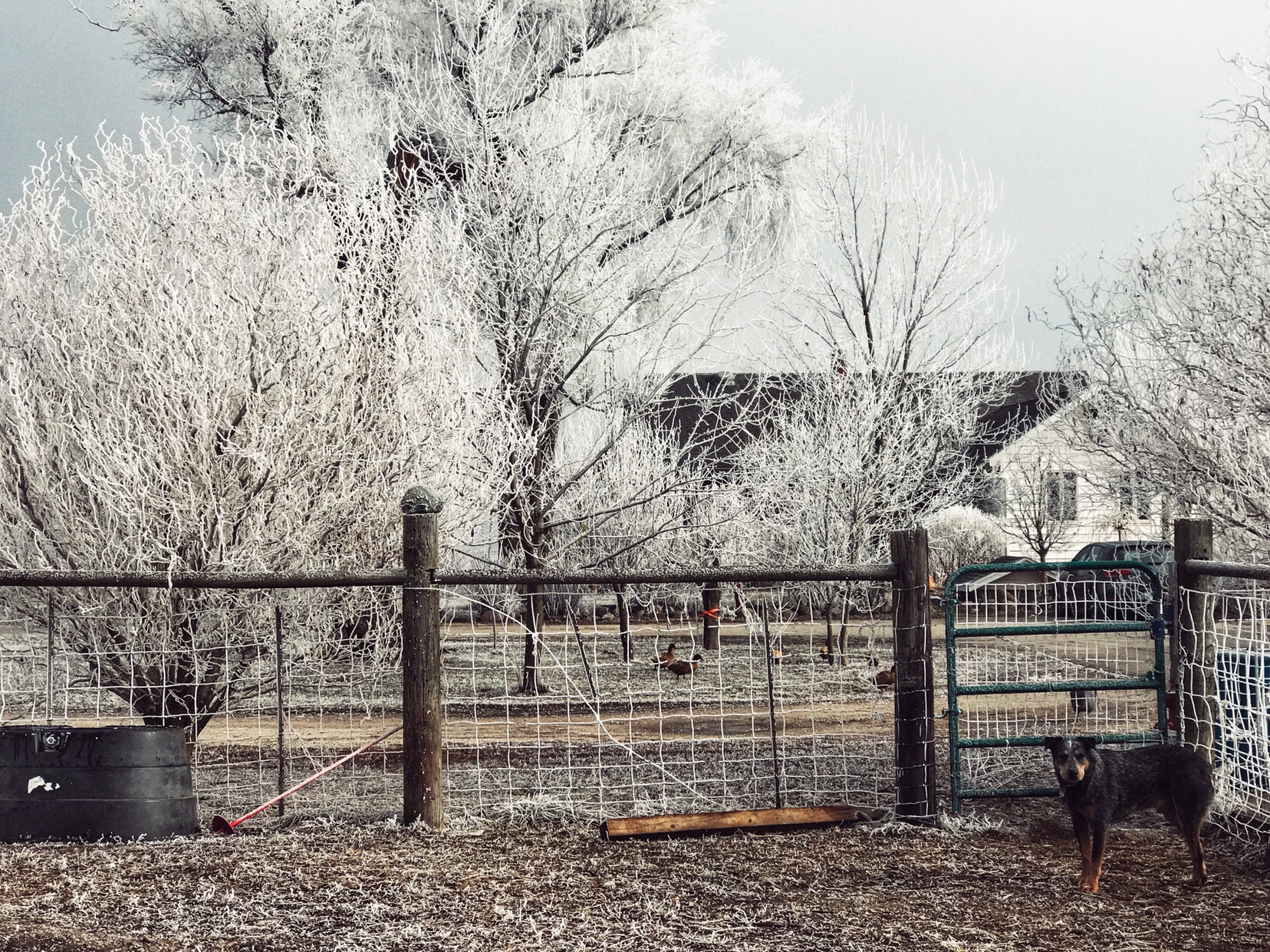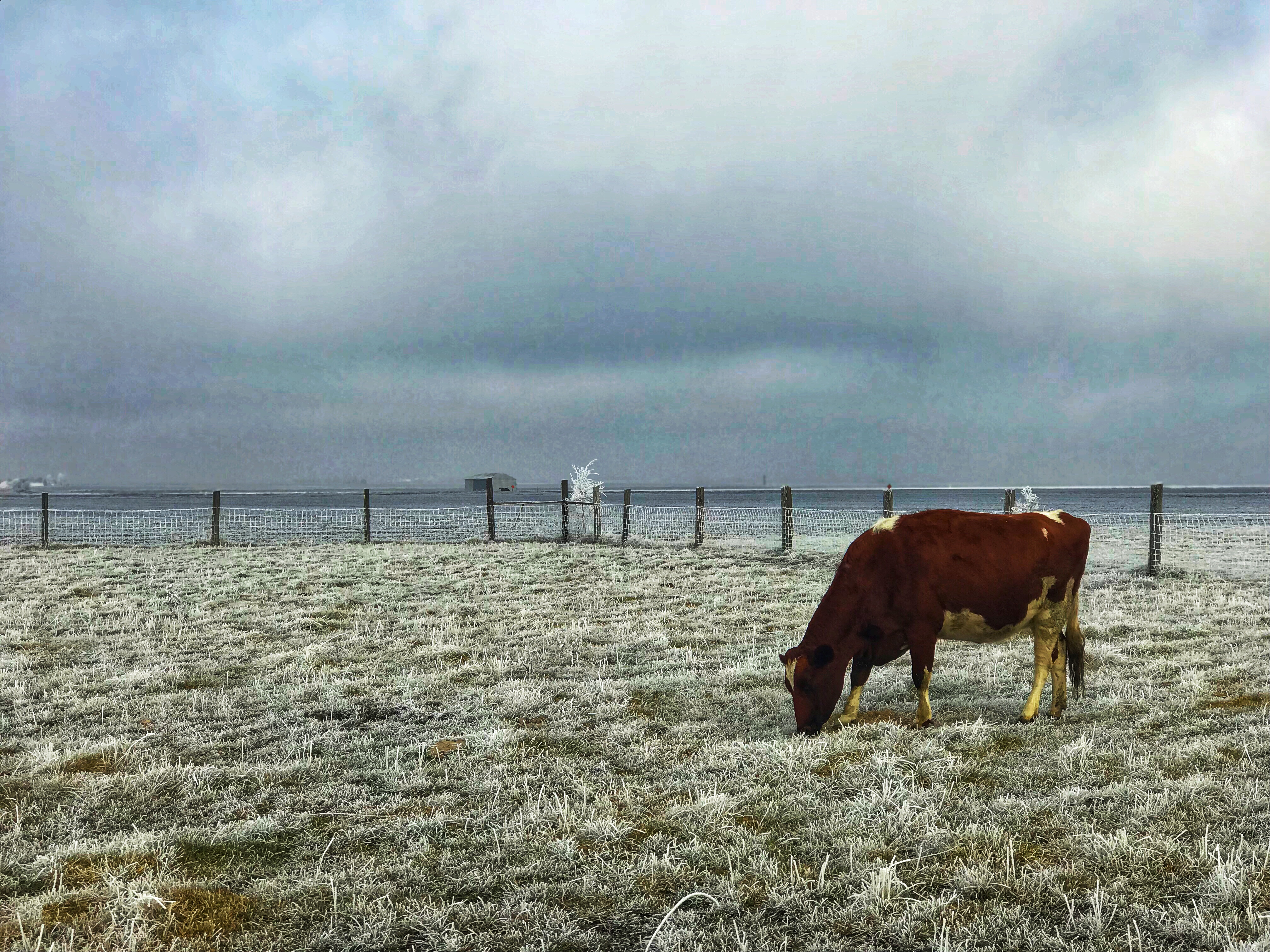 I laughed at the cows whose eyelashes were white from the sticky frost layering up on their hairs until I went inside and found that I was the same. The hair that had strayed from under my hat had the same treatment.