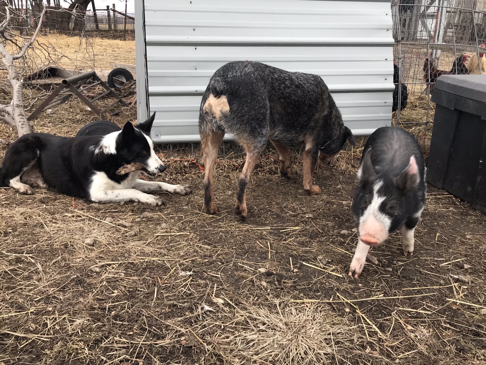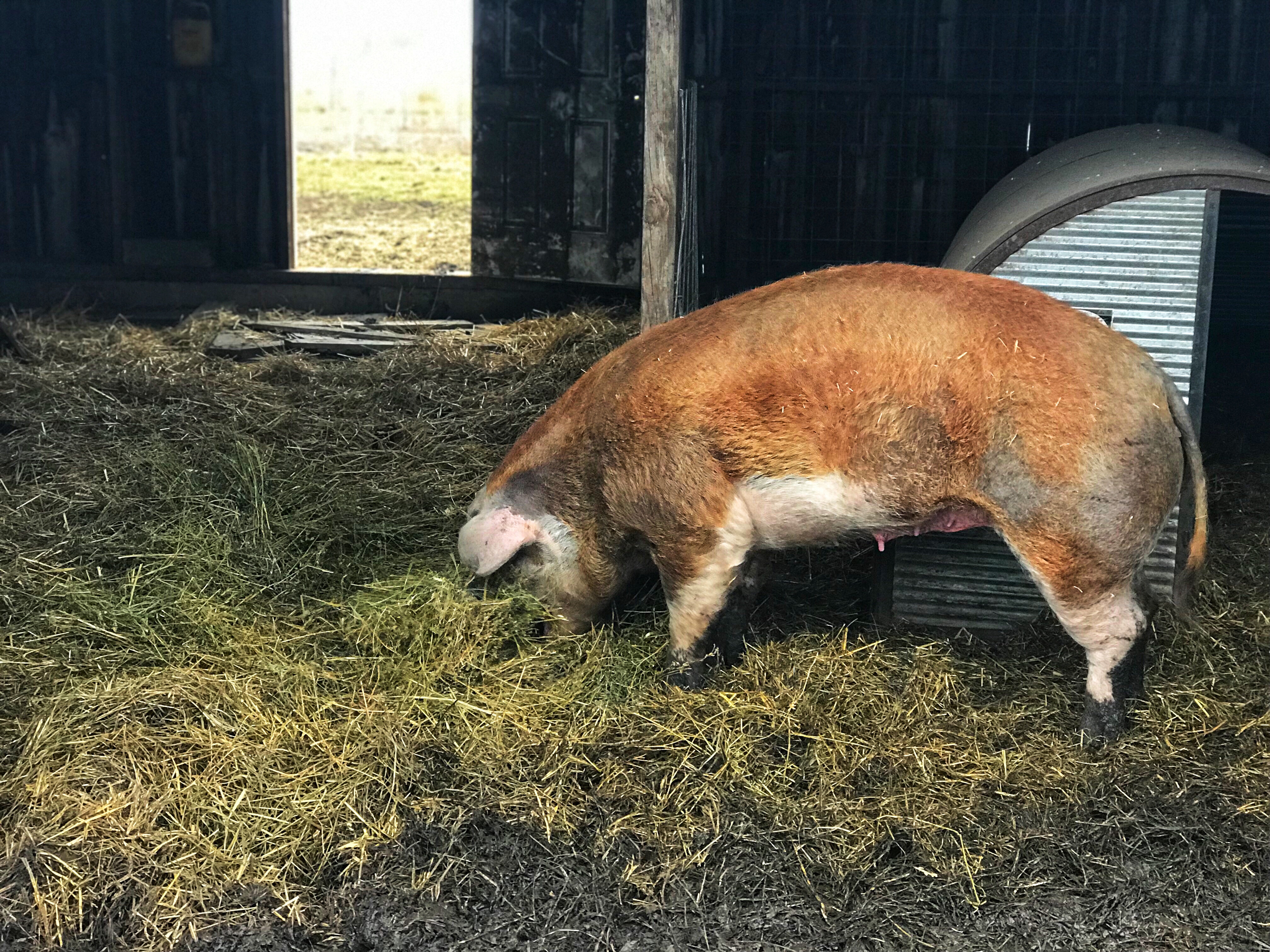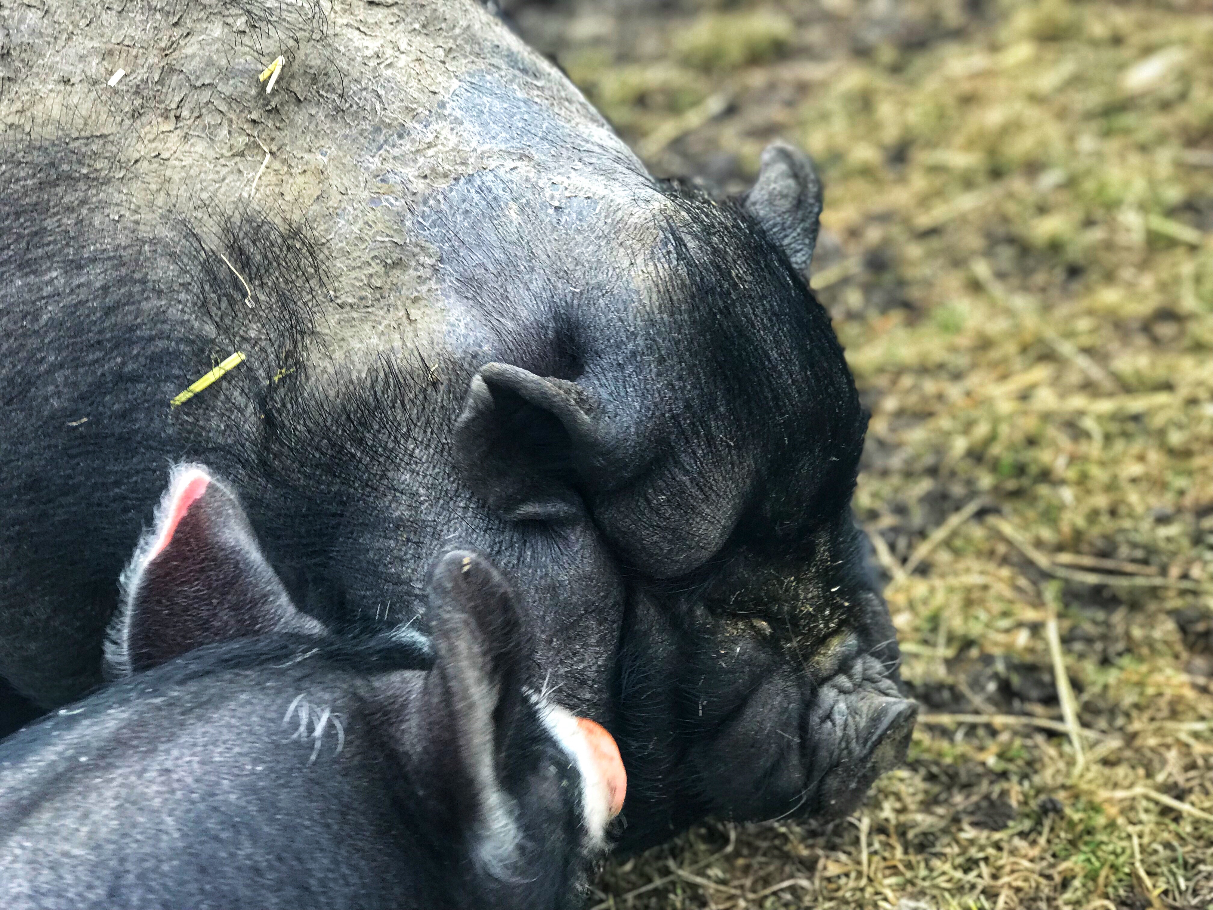 This (below) is not a sweet picture of Wai and Piglet. In seconds Wai will turn his great big head, kind of mark where Jude is with his nose, then back up three paces lower his head and launchhimself in, ramming the piglet. He never connects – Jude knows all his tricks and just dances squealing out of reach of the half blind grumpy potbelly.