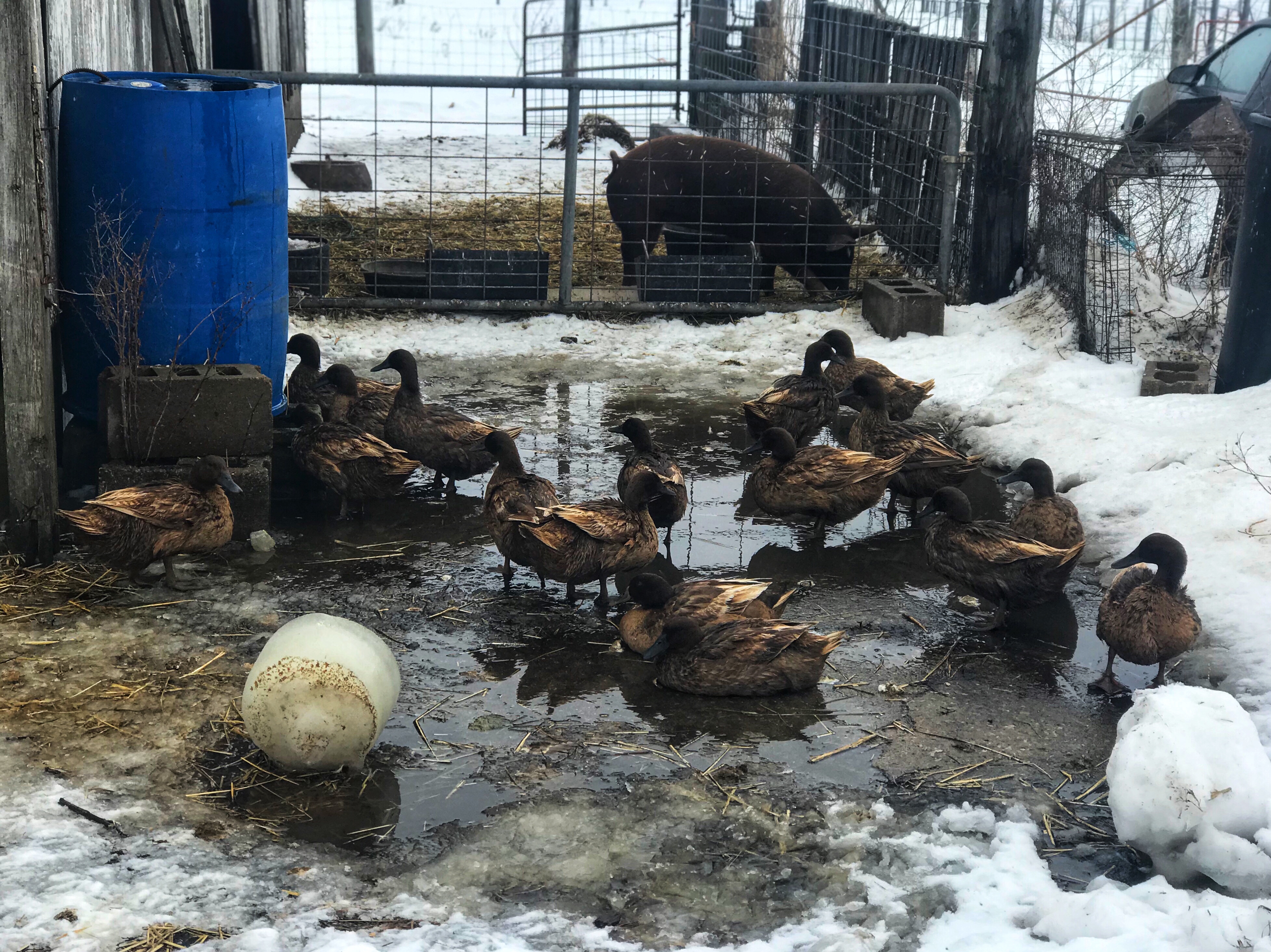 We went up above freezing yesterday and a lot of the ice melted which the ducks loved – but when the wind swung to the north the water began to freeze so fast – literally over the course of an hour – so I moved the dumb ducks back into the barn.