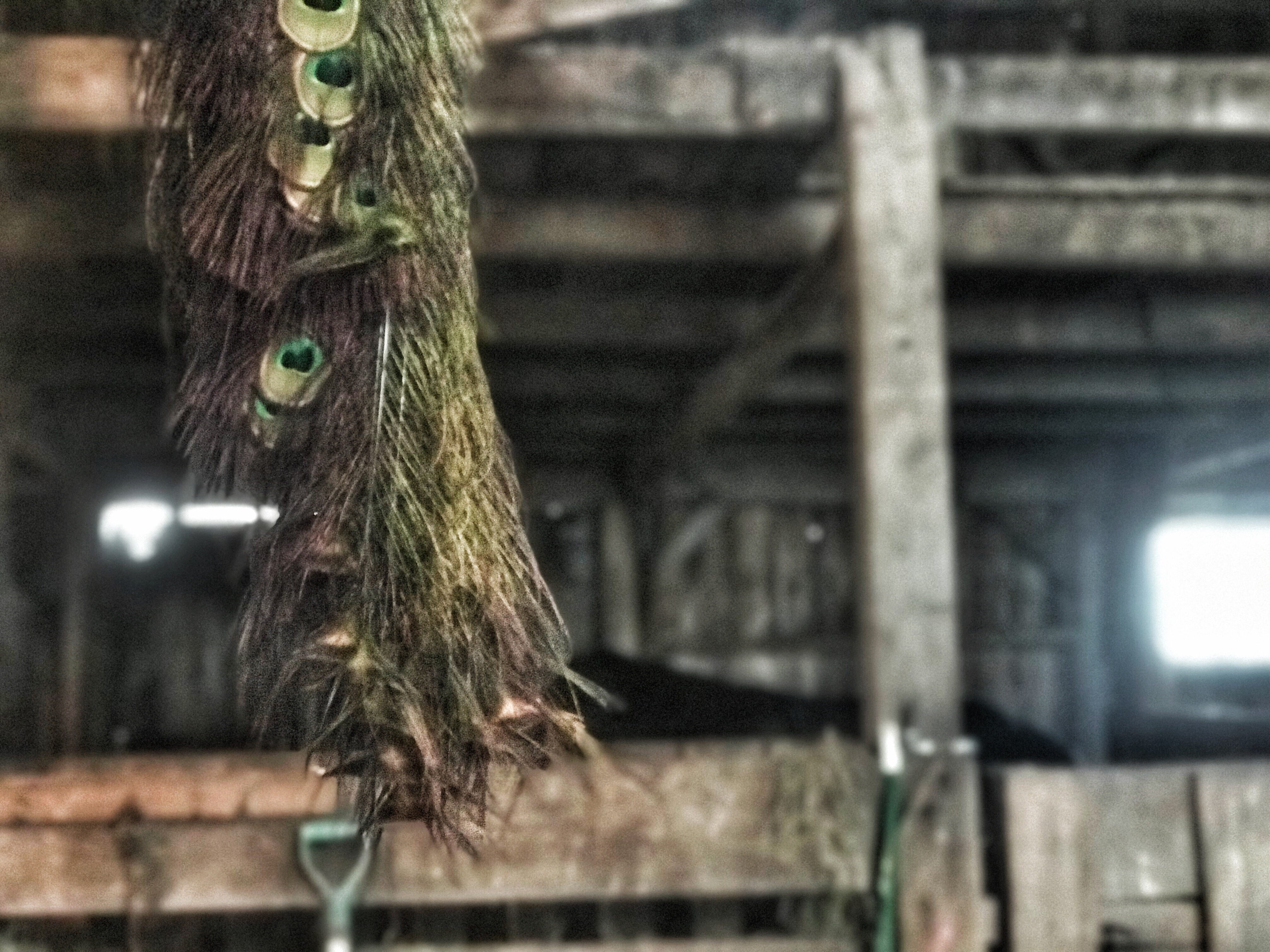Mr Flowers’s tail hangs down so low that it brushes my face as I walk through the barn. I can part the feathers like a curtain.