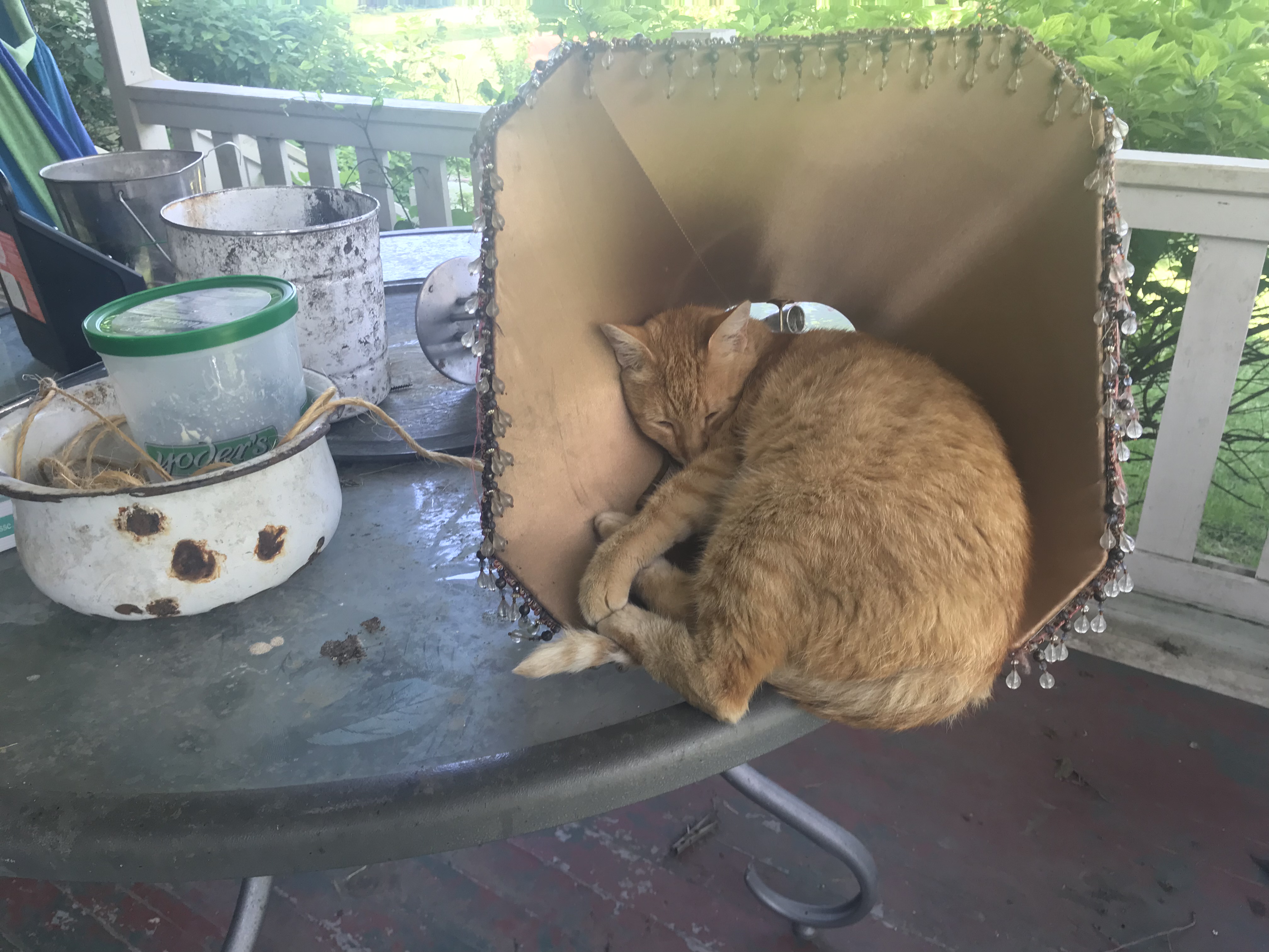 This is the state my outside table was in before I cleared it off to feed the men. That Cat!