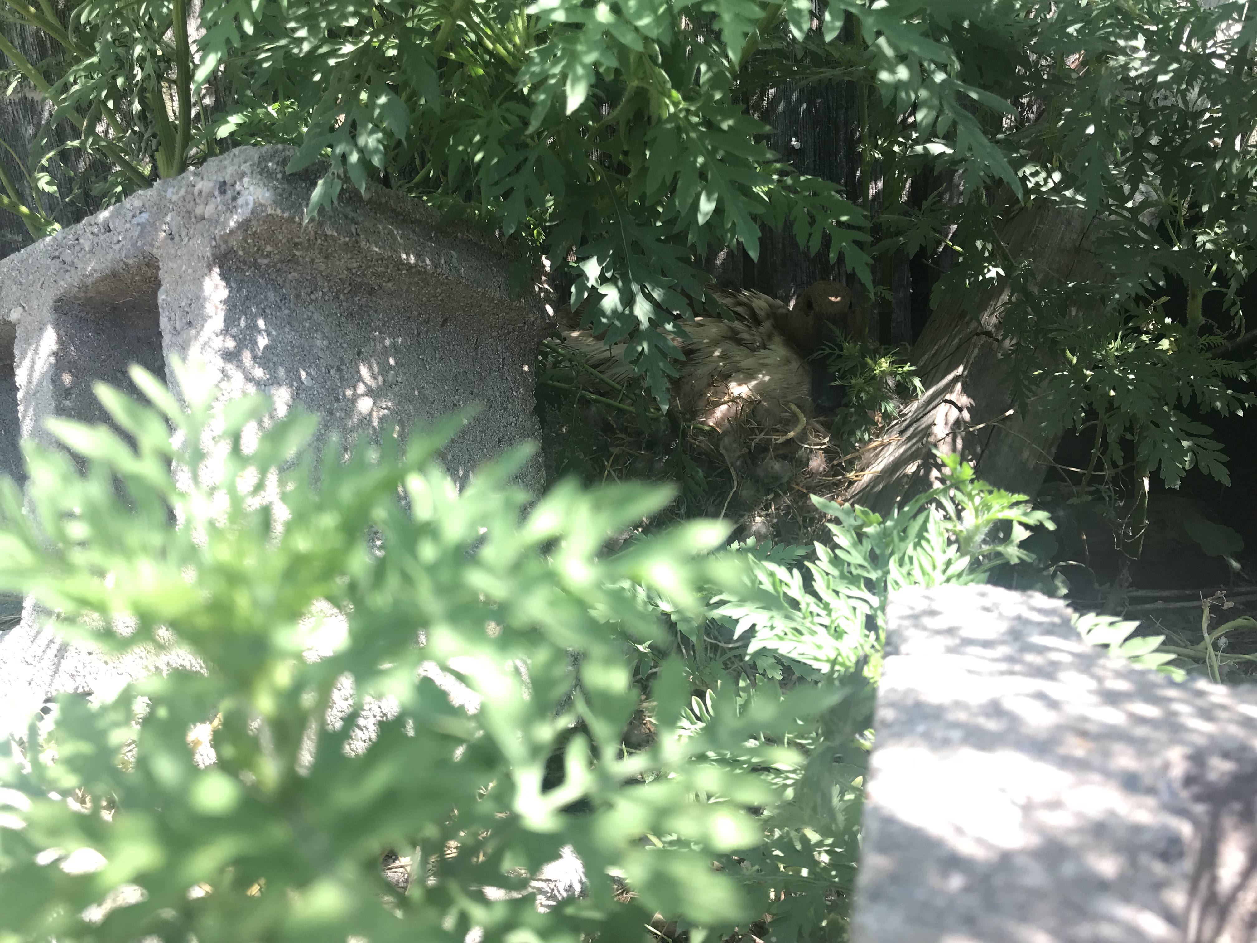 One duck has made a hidden nest right by the barn doors – shielded by a group of tall weeds. A beautiful nest too made with a pile of downy feathers. And with about ( after a quick glance) twenty eggs in there. Plus I saw another duck run in under the bush and come out a while later so I think there are at least two laying in there but maybe only one sitting.