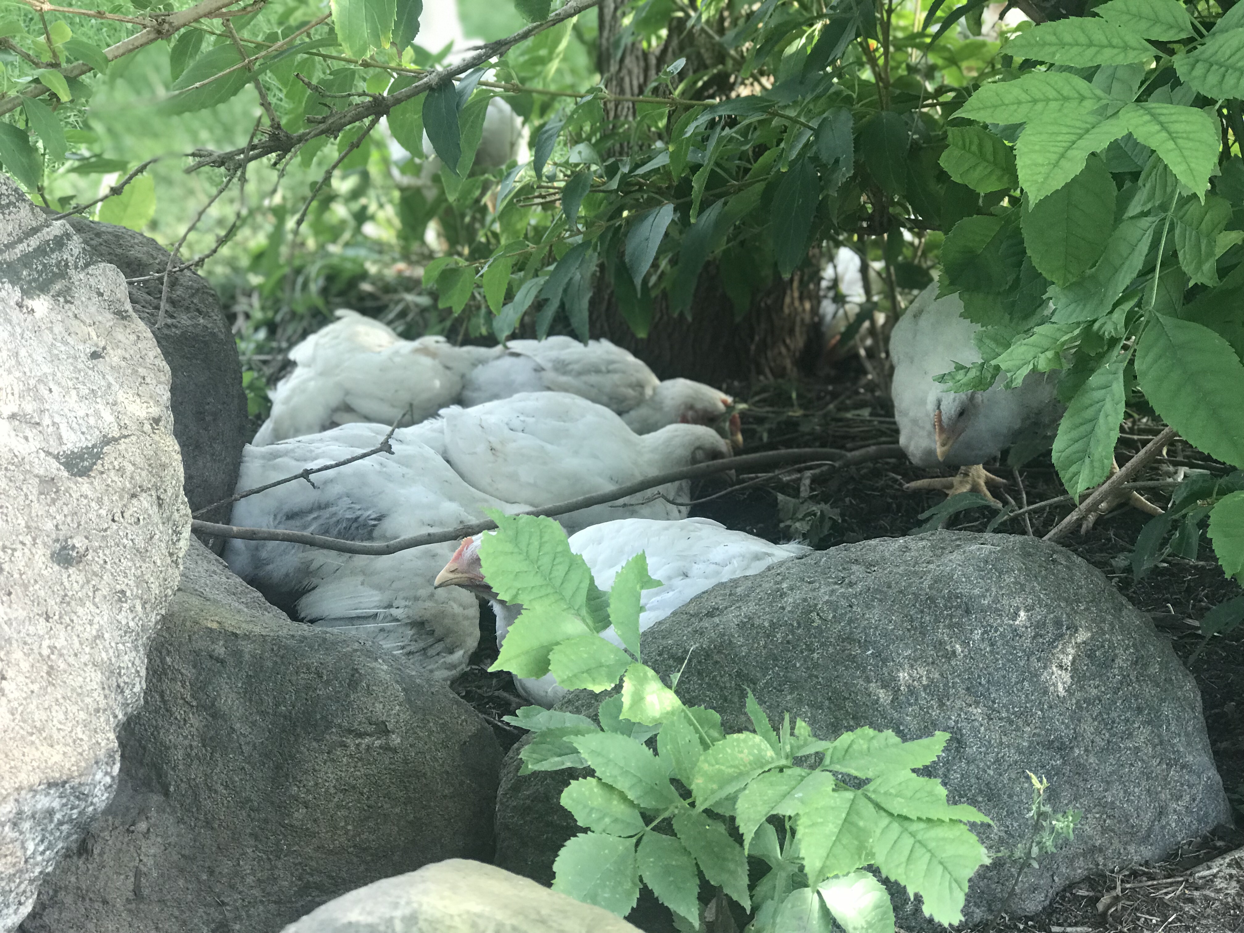 I came home yesterday to 46 fat white chickens waddling about the yard. Their door had drifted open. Thankfully they did not go too far but even more thankfully Boo did not bother them.