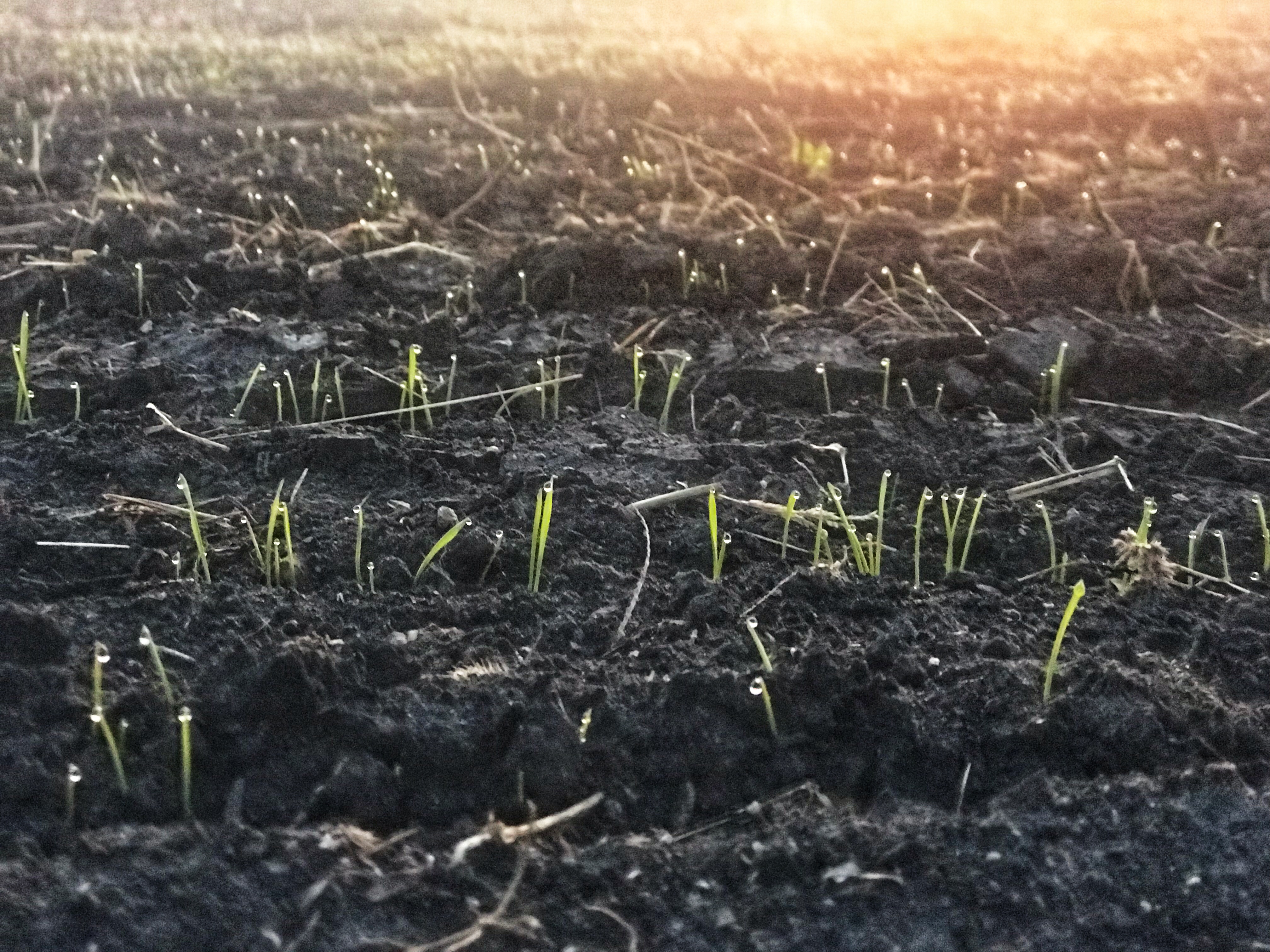 All around me. In all four cardinal directions – but nothing to do with the sins – the wheat is sprouting. Struck. Rising up! Wheat is a hardy grass. Some varieties are sown just before the cold really hits yet are strong enough to weather the horrible winter and return in the spring. No wonder it is good to eat!