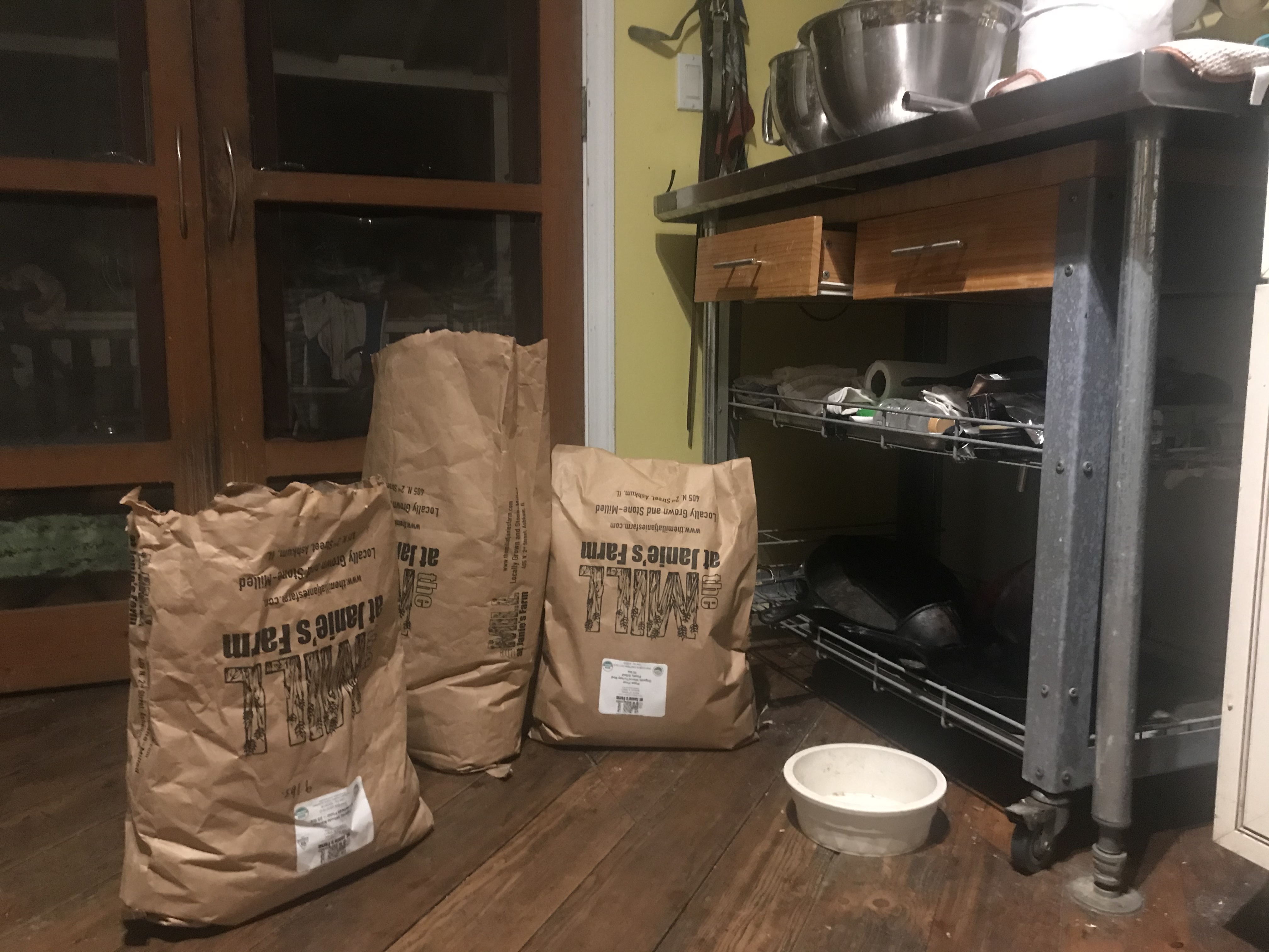Above is my kitchen last night. All about the flour. It rained and rained – perfect time for baking. After chores I was soaked to the skin and cold! I am not ready for the cold!