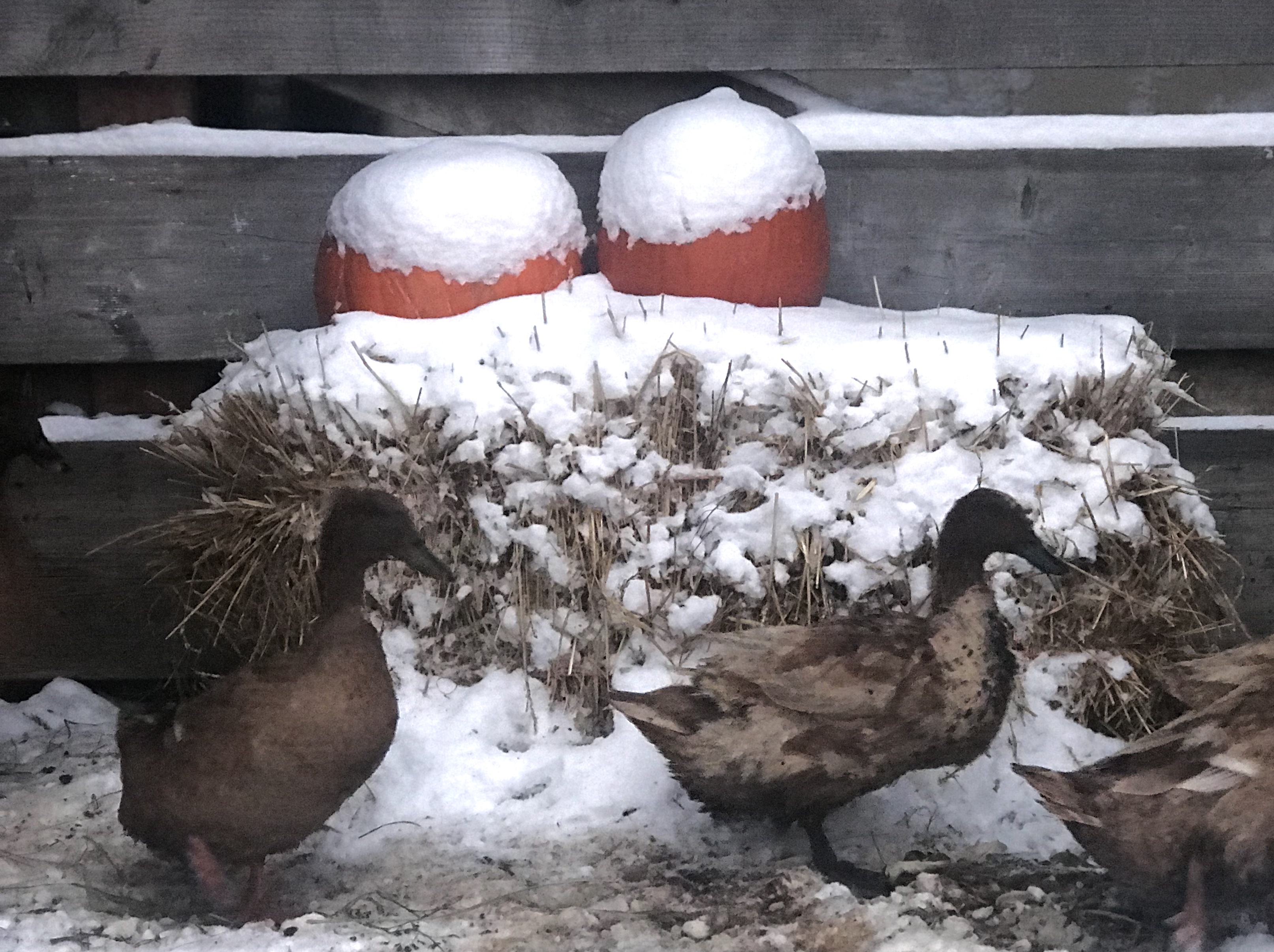 Here is a little freezing duck video for you. I hope it loads. On that really cold day the ducks would waddle along a bit then sit on their feet to warm them up again. And they insisted on breaking the ice on their muddy pond so they could all flap about in there. The water froze to their feathers and they looked a bit silly. Funny ducks.