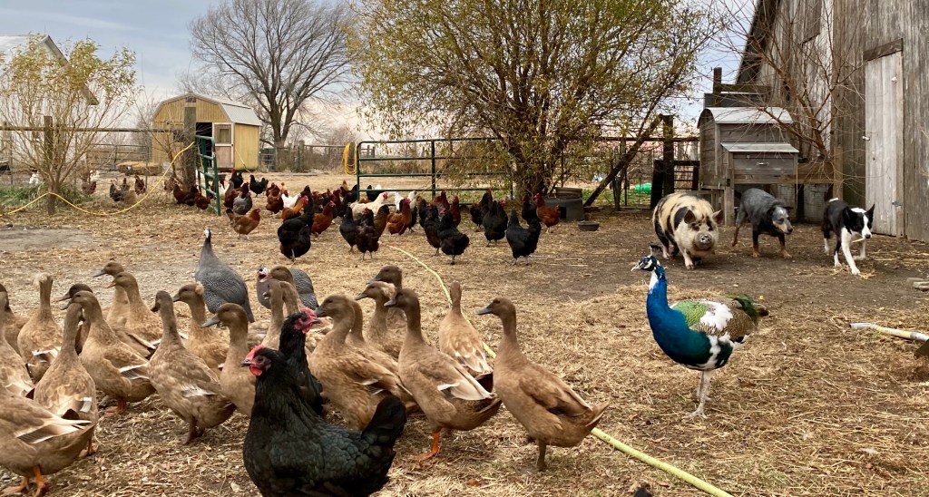 The barn yard is all birds and a few pet pigs now. The dogs – the five cats and the Guineas and the peacocks are all present and accounted for but have become a large homogenous flock.