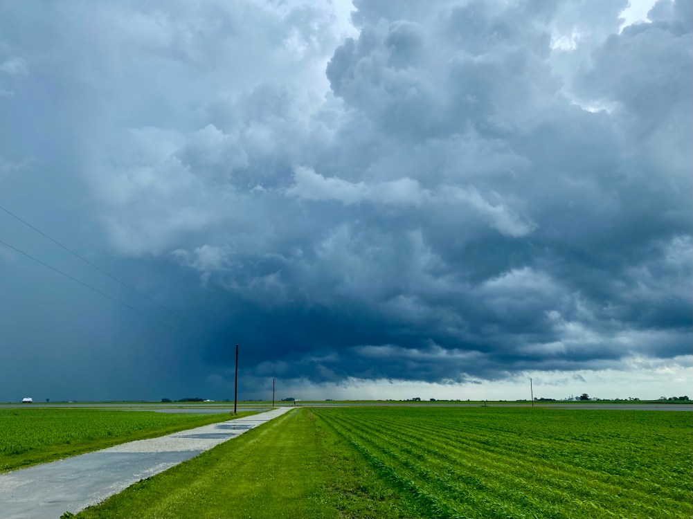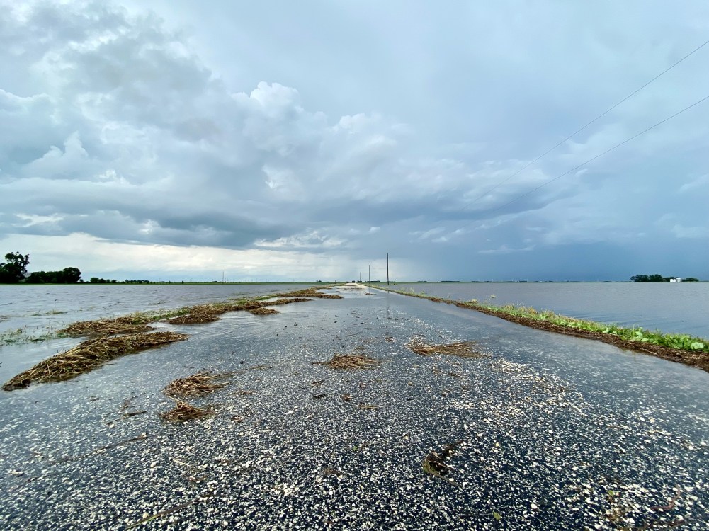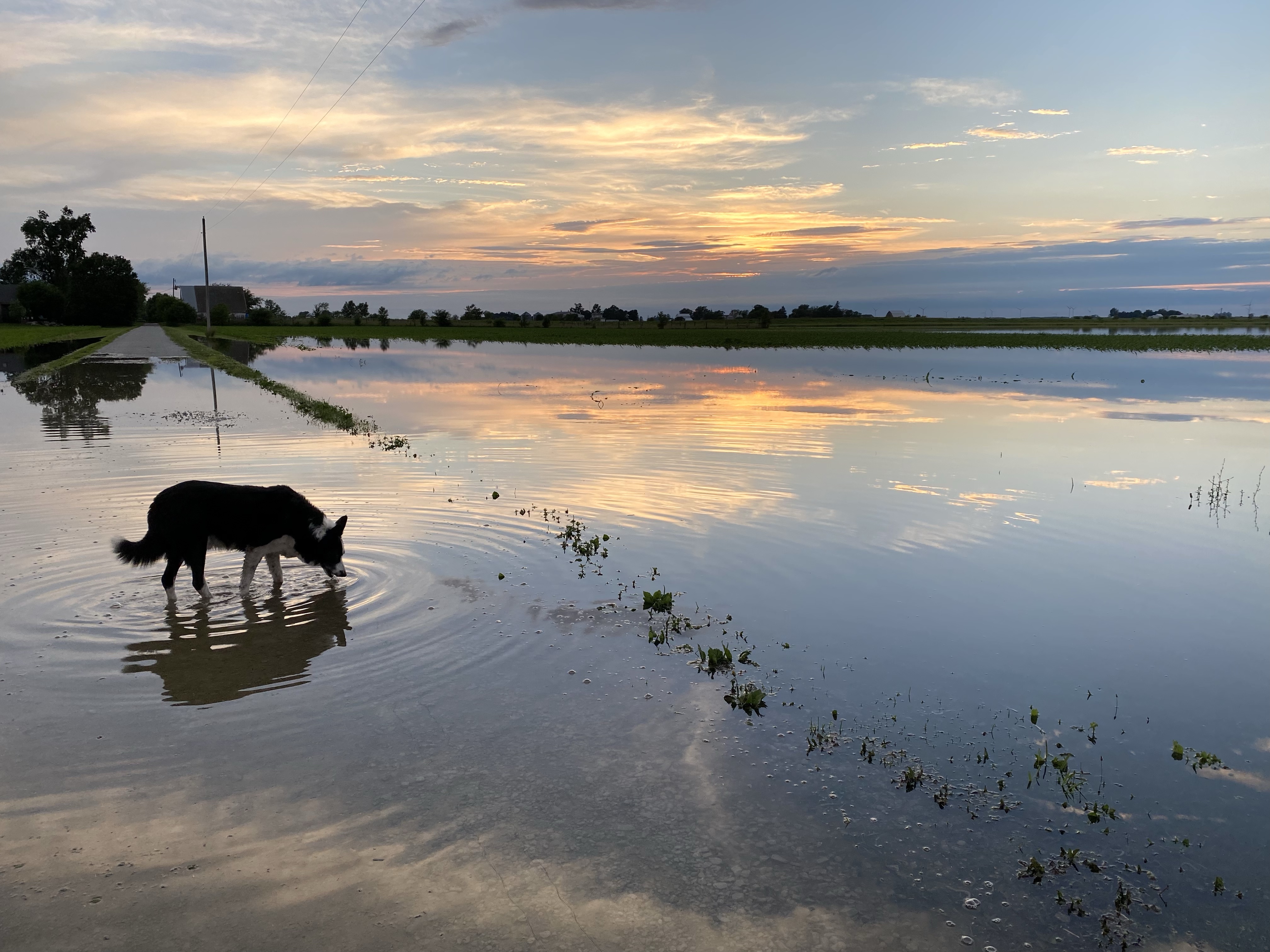 The flooded ditch water poured through the hole and into our fields. All the crops in our fields except a few higher islands of new corn are drowned. The road was closed with waves of water washing over it. I could not get my car out and the basement was flooding and holes were appearing in the plaster in the ceiling above old windows so I waited it out. My little car could not get through the water until yesterday – the rain started on Friday.