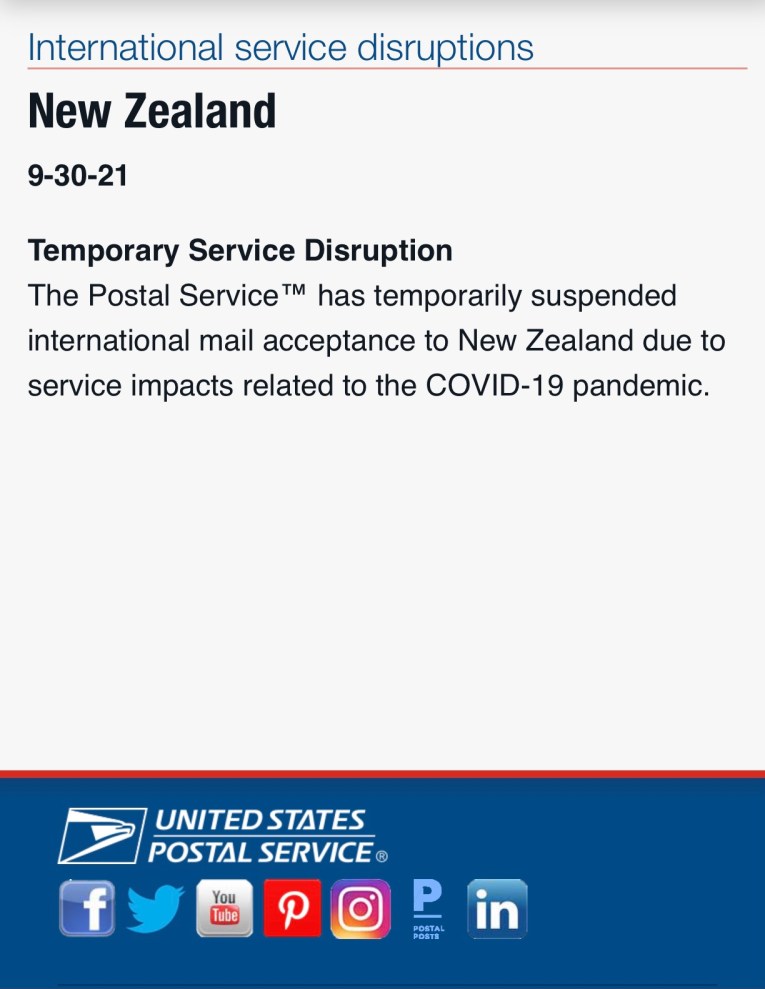 More information in this article, if you’re interested: https://www.stuff.co.nz/business/industries/126562992/covid19-usps-stops-nz-mail-service-due-to-unavailability-of-transportation
