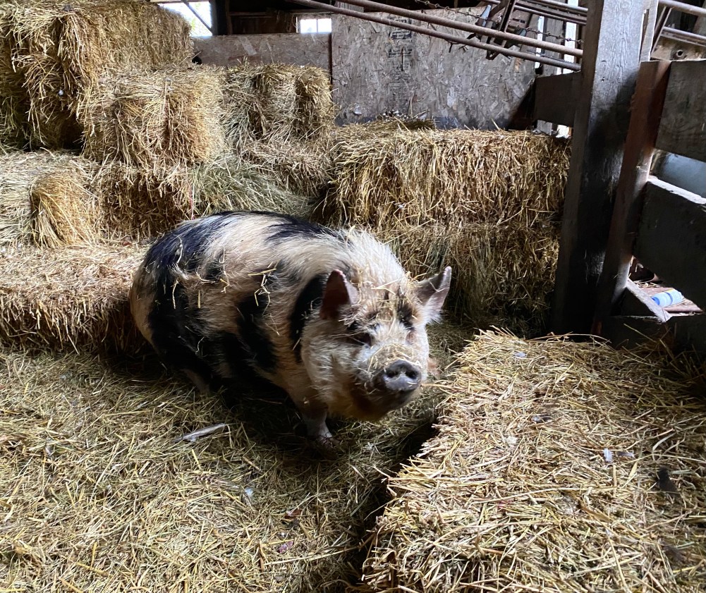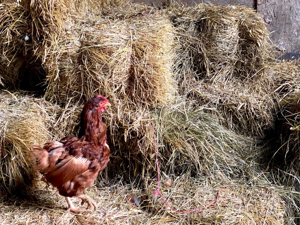 Tima. Still in her diet barn and the corn is still standing in the field – too wet to combine. So she has to stay there. She does not mind so much – she has cows and chooks and ducks to keep her company.