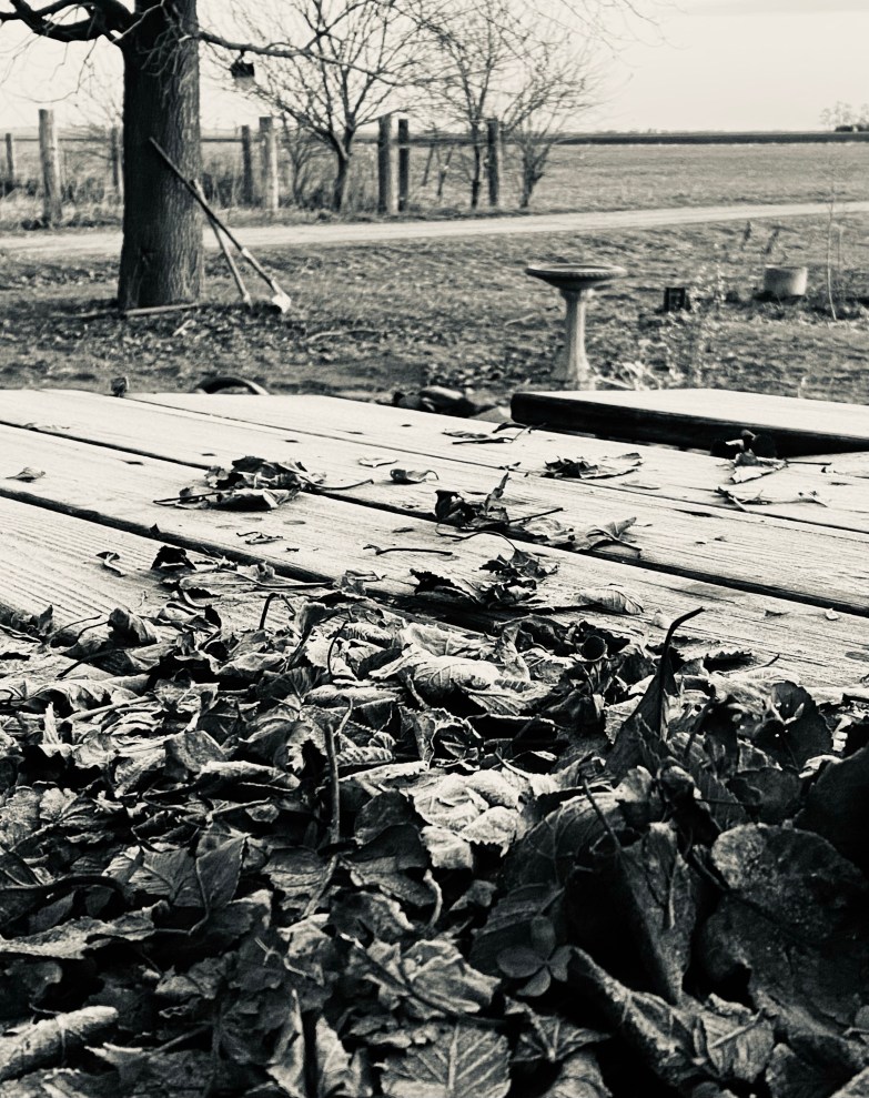 4. If it weren’t for that one brown leaf wedged between the deck boards giving the occasional flutter in the breeze, I’d almost swear this was a black and white still with the cock’s crow overdubbed as background…