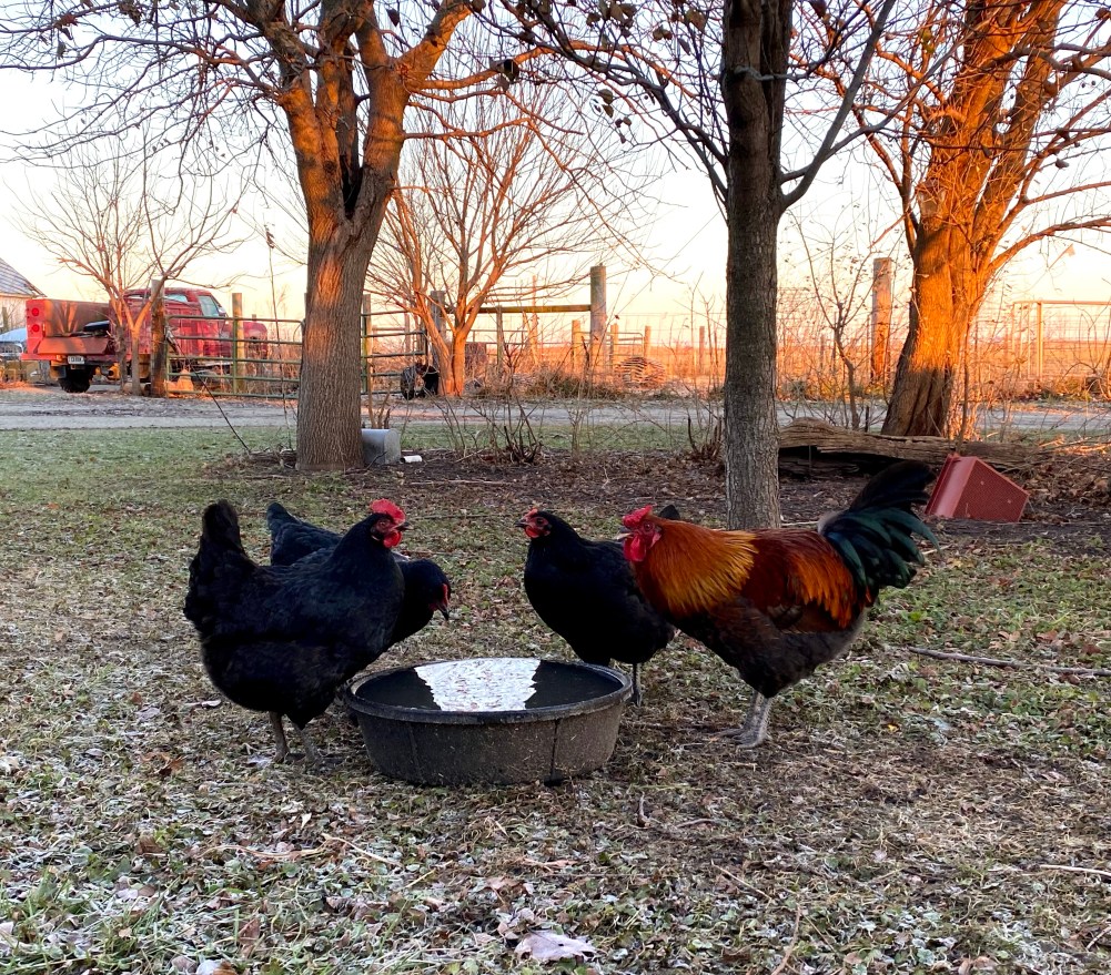 The theory is to fill the water bowl with warm water in the morning then empty the bowl after the last chores at night so it is not full of ice by the following morning – making it hard to refill! We can’t leave a heater in it – not with ducks.