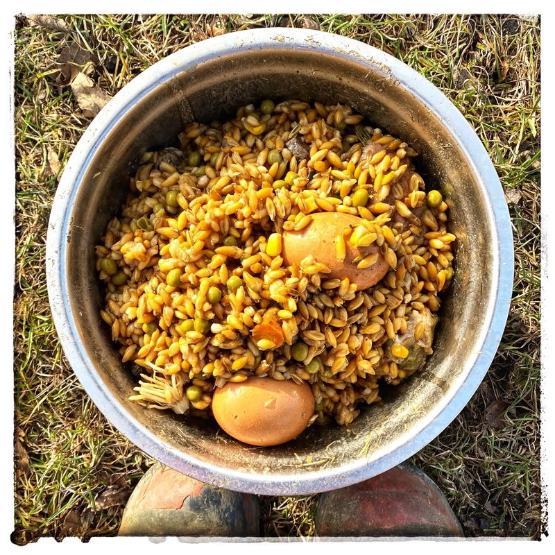 Here is a shot of the pig food. Grains from the fields cooked overnight in the slow cooker with all the kitchen scraps of the day. Plus I drop in some eggs to boil in there as well. For the protein. As you know our pigs are all vegetarians. We only have one plonker this year and he is having the time of his life with the run of the barn.