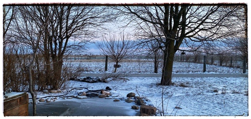 Light snow covering deck edge, frozen duck pond, snow on the track and across the field  with just a touch of dawn colour on the horizon.