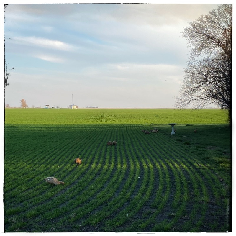 1. Your green-up (as people used to say in my Kentucky childhood – maybe still do) wheat rows make a beautiful picture criss-crossed with sun rays & decorated with ducks.
