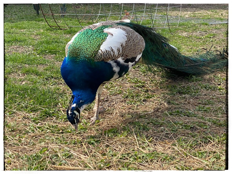 Then he leapt up and flew at speed through the assembled roosters (it was dinner time) scattering them in all directions.
