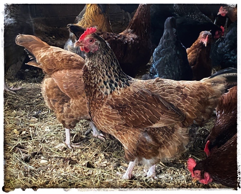 Brown, black and cream chicken, looking straight to camera, surrounded by all her feathered friends.