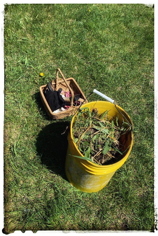 I drag weed buckets with me as I go. Thistles into one bucket to be burned and weeds in the other for the pigs and the chickens.