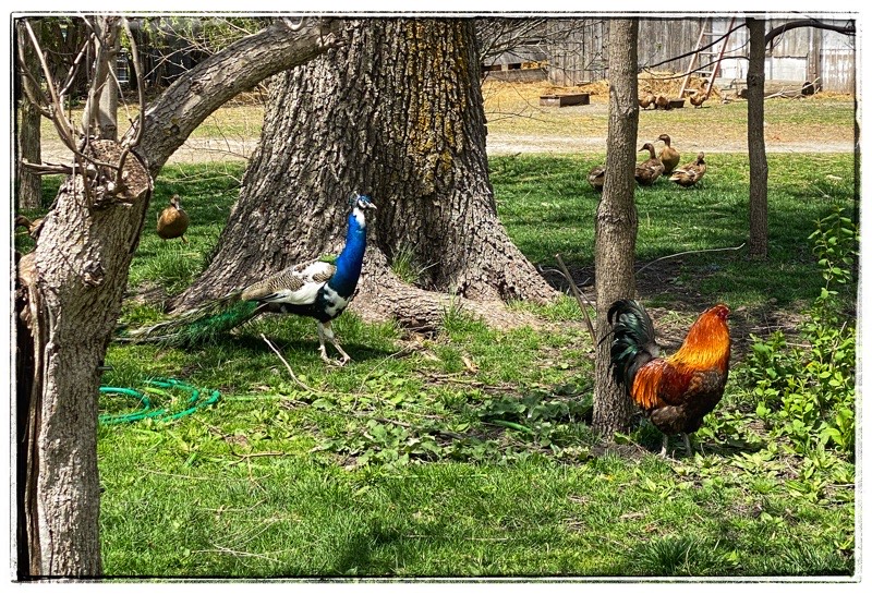 Rescue pot belly, peacock, roosters and ducks walking to the feed shed in  anticipation of dinner.